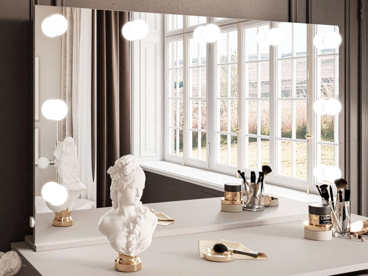 Ein besonderes Highlight des Schminktischs Melo Elite ist der große Spiegel, der von neun LED-Lichtpunkten umrahmt ist. Diese erzeugen ein natürliches, augenfreundliches Licht, das sich hervorragend für das Schminken eignet. Die LED-Beleuchtung wird über ein Netzkabel betrieben, das im Lieferumfang enthalten ist.