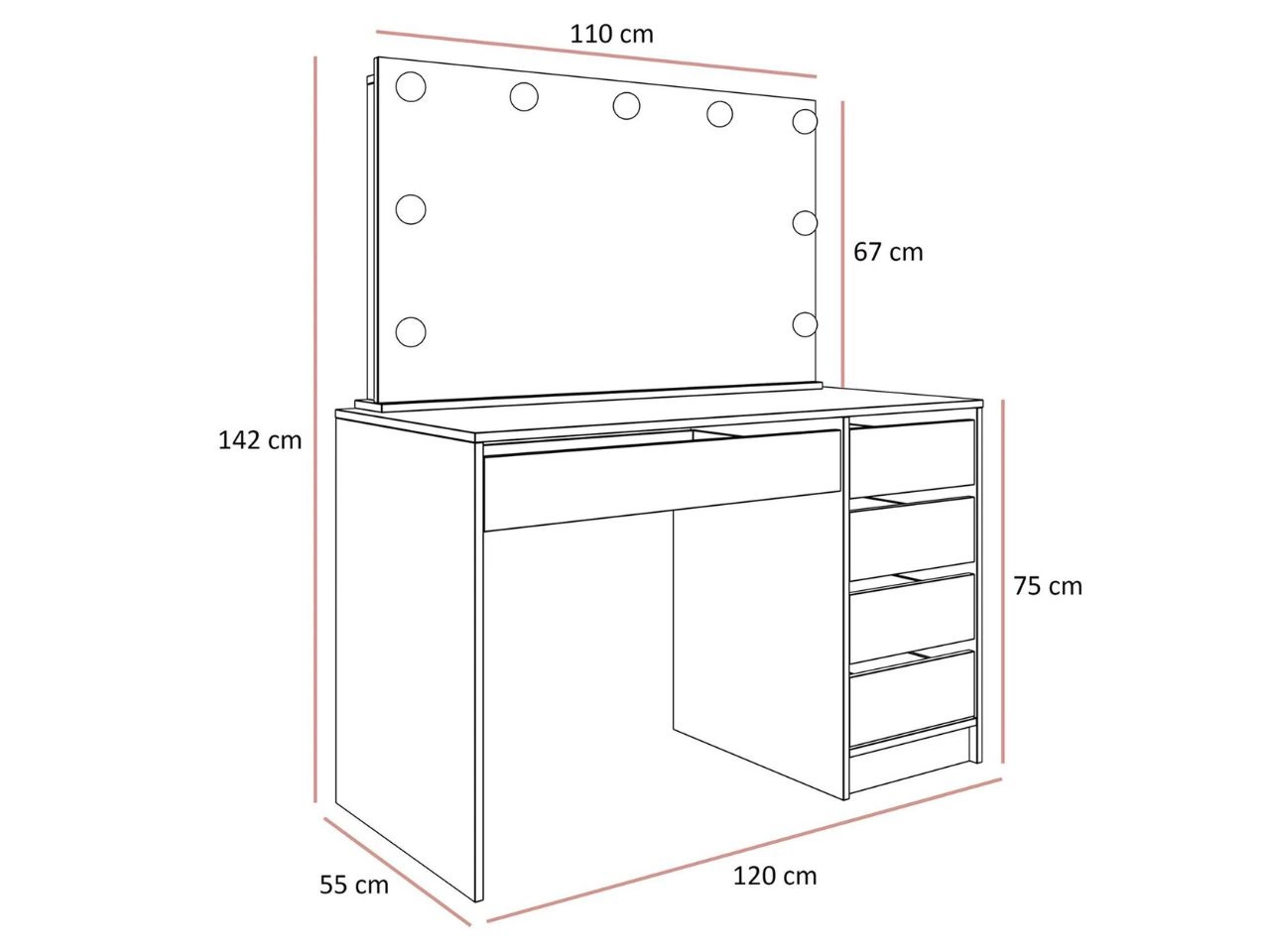 Die Konstruktion des Schminktischs Melo Elite besteht aus hochwertiger laminierter Platte, deren Kanten mit ABS-Kante verstärkt wurden. Dieses Material schützt das Möbelstück vor Kratzern und kleinen Beschädigungen. Unter der breiten Tischplatte befinden sich fünf geräumige Schubladen, die sich ideal für Kosmetik oder Schmuck eignen. Dank Kugelführungen lassen sich die Schubladen leicht und vollständig ausziehen. Ein zusätzlicher Vorteil ist die Möglichkeit, die Schubladen je nach Vorlieben auf der linken oder rechten Seite zu montieren.