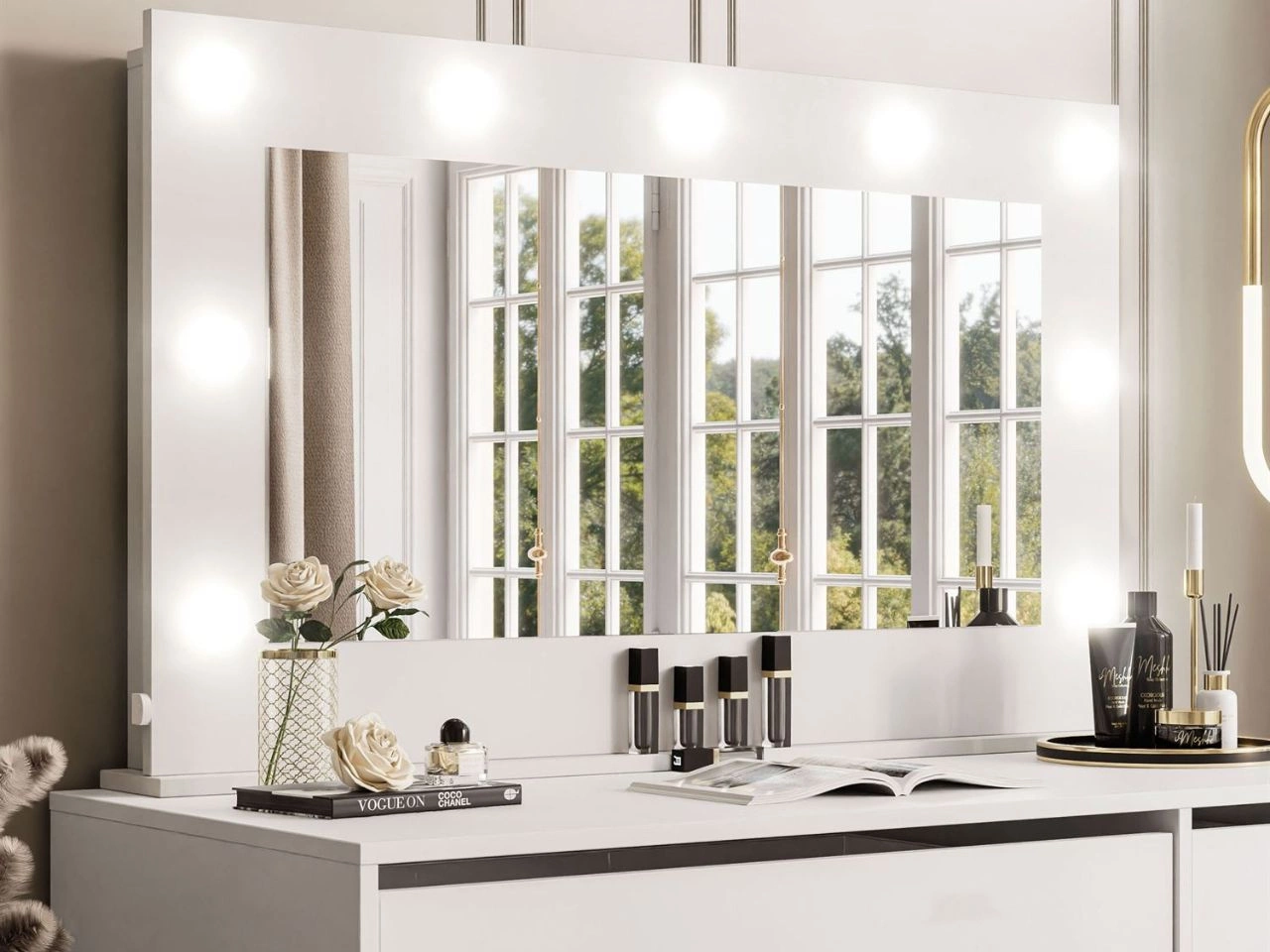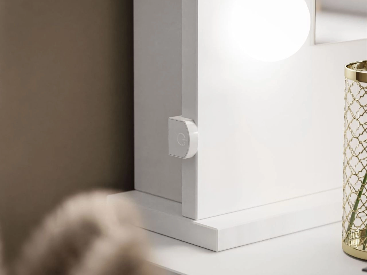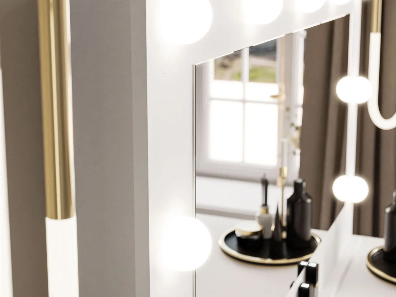 Das besondere Highlight des Schminktischs Melo ist der große Spiegel mit weißem Rahmen, der von neun LED-Lichtpunkten umgeben ist. Diese sorgen für ein natürliches, sanftes Licht, das sich ideal zum Schminken eignet. Die LED-Beleuchtung wird über ein Netzkabel betrieben, das im Lieferumfang enthalten ist.