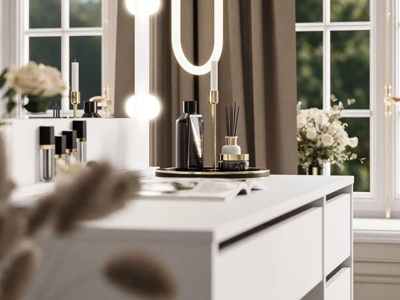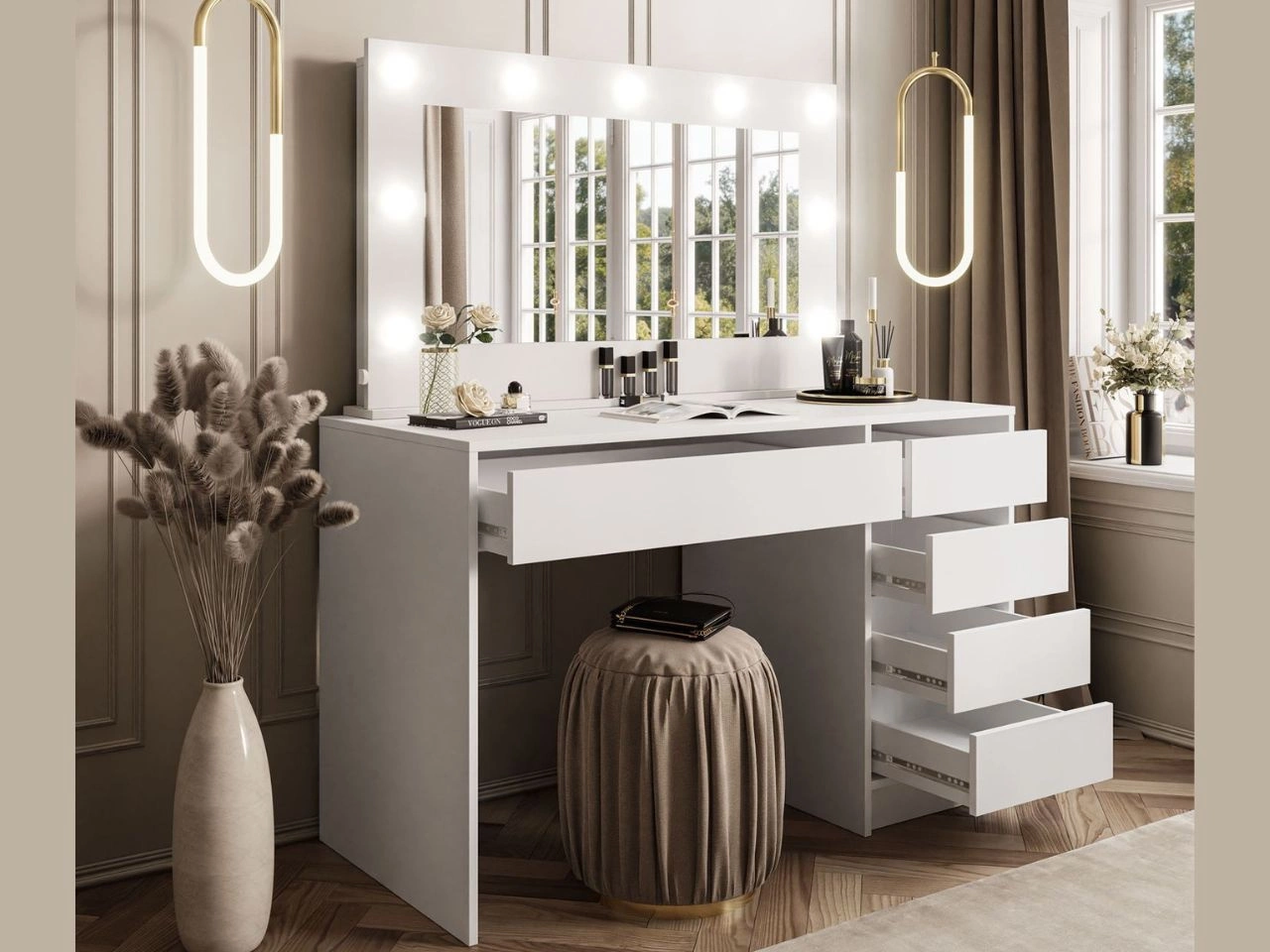 Der Korpus des Schminktischs Melo besteht aus hochwertiger laminierter Platte, deren Kanten mit ABS-Kante geschützt sind. Dadurch ist das Möbelstück widerstandsfähig gegen kleine Schäden und Kratzer. Unter der breiten Tischplatte befinden sich fünf geräumige Schubladen, die sich perfekt zur Aufbewahrung von Kosmetika und Accessoires eignen. Die Schubladen sind mit Kugelführungen ausgestattet, die einen vollständigen und reibungslosen Auszug ermöglichen. Je nach Bedarf können sie auf der linken oder rechten Seite montiert werden.