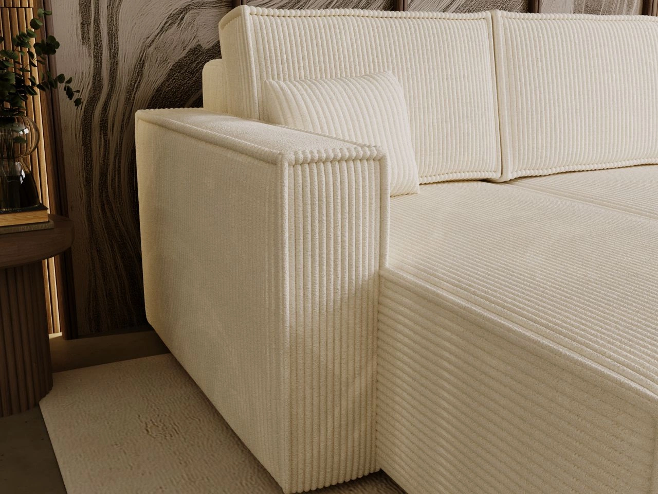 Cord-Ecksofa Prato L ist ein elegantes Polstermöbel im modernen Stil, das Komfort und Funktionalität perfekt vereint. Bezogen mit dem Cordstoff Poso 100 in kühlem Beige, bringt es eine gemütliche und zugleich trendige Atmosphäre ins Wohnzimmer. Die feine Struktur des Stoffes betont die Weichheit des Sofas und macht es zum zentralen Blickfang im Raum.