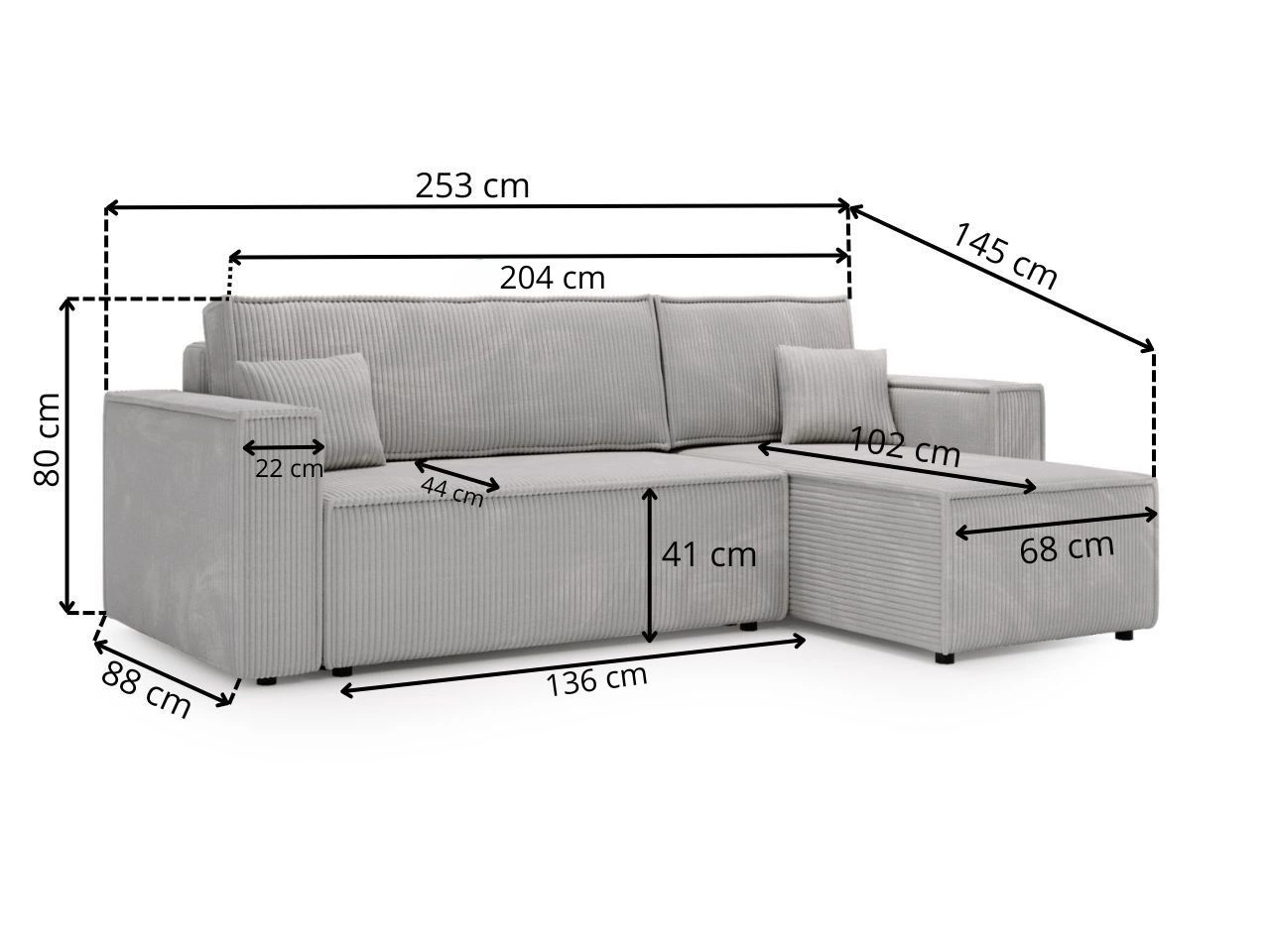 Die stabile Konstruktion des Sofas wird durch schwarze Füße mit einer Höhe von 2,5 cm unterstützt, während die breiten Seiten als bequeme Armlehnen dienen und den Alltagskomfort erhöhen. Die sorgfältige Verarbeitung verbindet modernes Design mit Langlebigkeit und macht das Ecksofa zu einer idealen Wahl für zeitgemäße Wohnräume. Zudem ermöglicht die universelle Bauweise des Ecksofas Prato eine flexible Anpassung an den Raum – wahlweise in der linken oder rechten Ausführung.