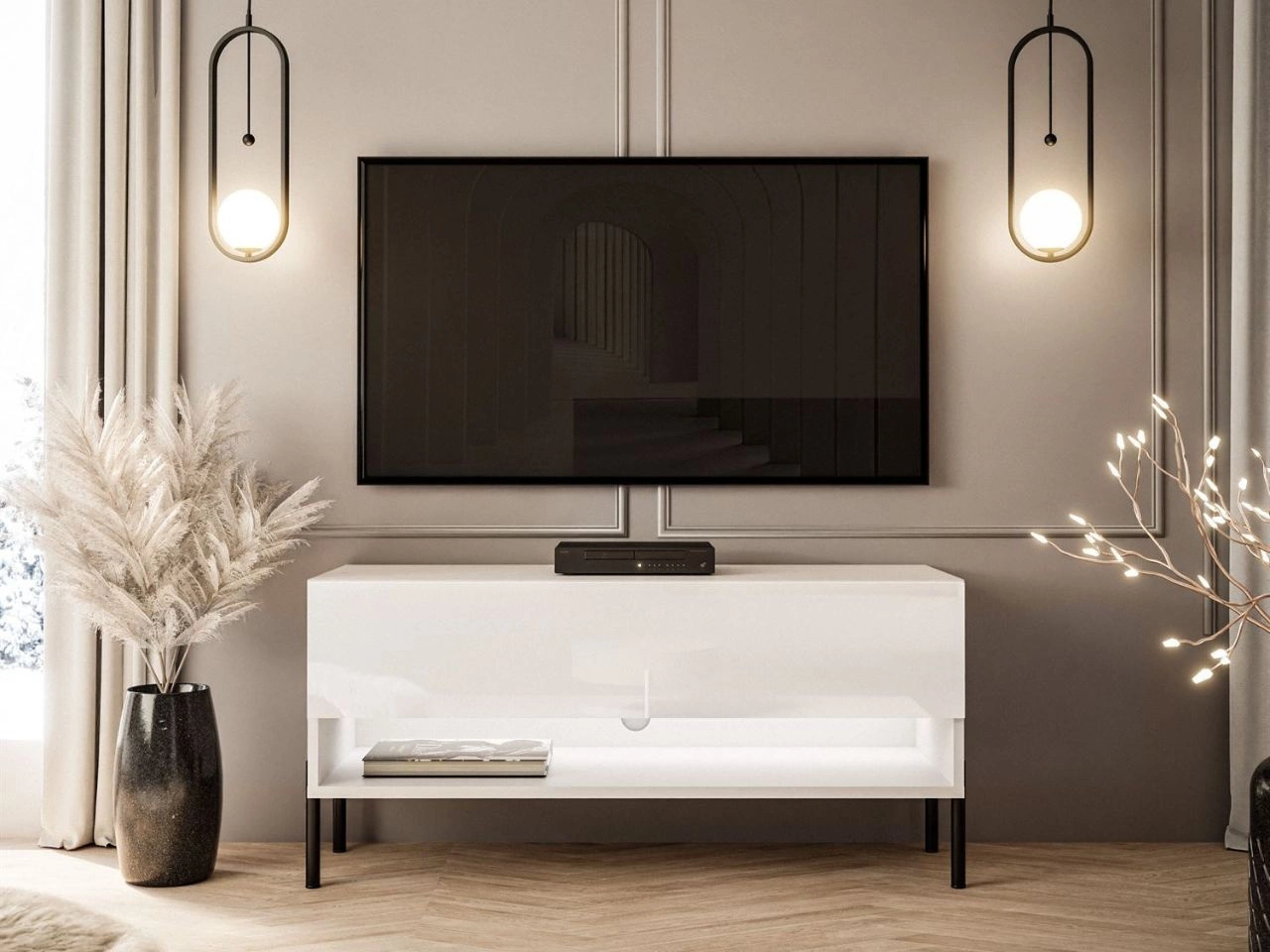 TV-Schrank 90 cm mit LED-Beleuchtung und schwarzen Metallbeinen Aurelie Weiß Hochglanz