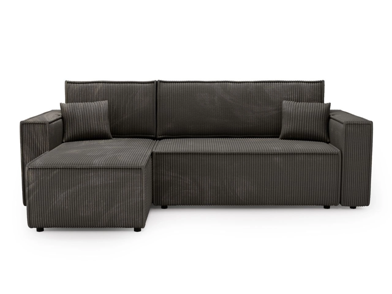 Die stabile Konstruktion des Sofas wird durch schwarze Füße mit einer Höhe von 2,5 cm unterstützt, während die breiten Seiten als bequeme Armlehnen dienen und den Alltagskomfort erhöhen. Die sorgfältige Verarbeitung verbindet modernes Design mit Langlebigkeit und macht das Ecksofa zu einer idealen Wahl für zeitgemäße Wohnräume. Zudem ermöglicht die universelle Bauweise des Ecksofas Prato eine flexible Anpassung an den Raum – wahlweise in der linken oder rechten Ausführung.