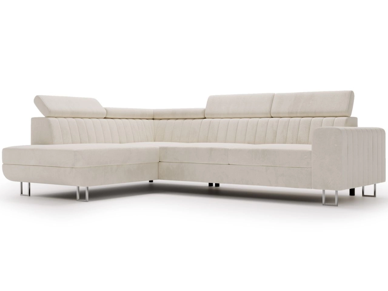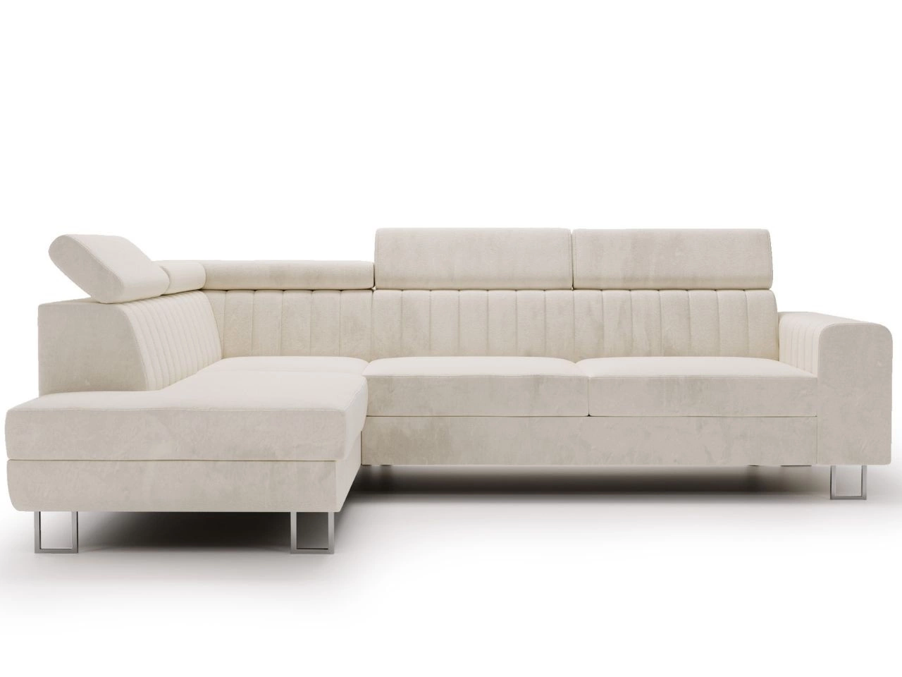 Das Modell in L-Form mit linksseitiger Ottomane bietet einen komfortablen Platz zum Entspannen. Die Sitzhöhe von 42 cm sowie verstellbare Kopfstützen sorgen für hohen Nutzungskomfort. Dank der durchdachten Konstruktion dient das Ecksofa sowohl als täglicher Rückzugsort als auch als zusätzliches Bett.