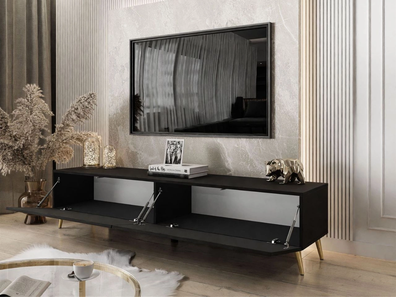 TV-Lowboard mit zwei Türen auf golden Beinen 175 cm mit LED-Beleuchtung Sorelle Schwarz Matt