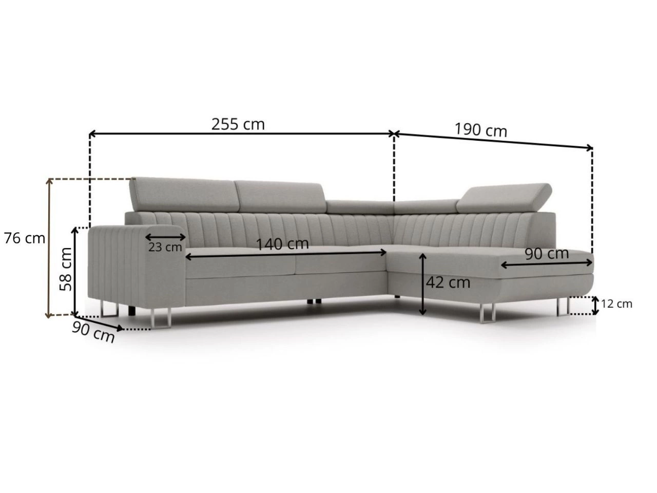 Das Modell in L-Form mit rechtsseitiger Ottomane bietet einen komfortablen Platz zum Entspannen. Die Sitzhöhe von 42 cm sowie verstellbare Kopfstützen sorgen für hohen Nutzungskomfort. Dank der durchdachten Konstruktion dient das Ecksofa sowohl als täglicher Rückzugsort als auch als zusätzliches Bett.