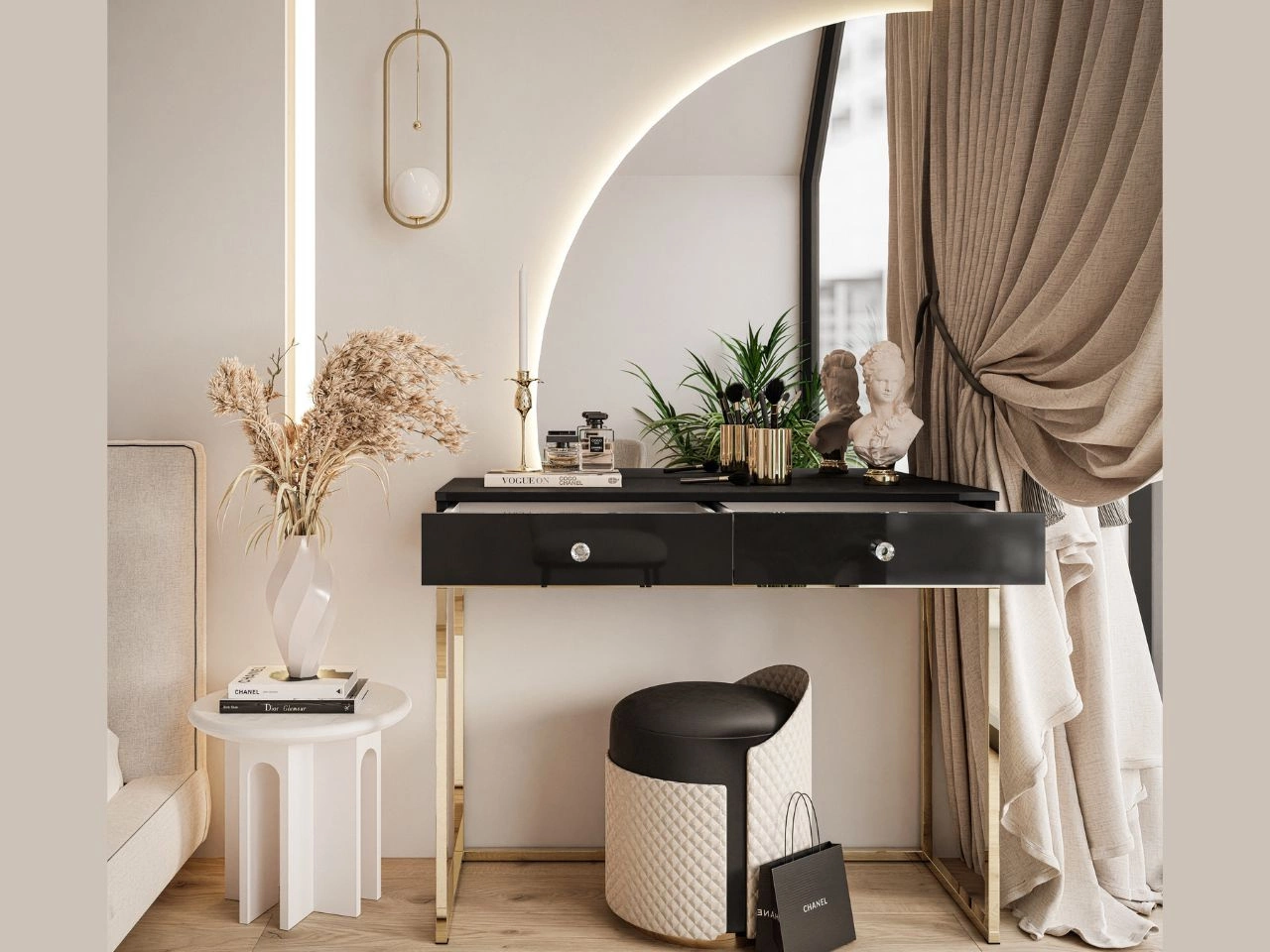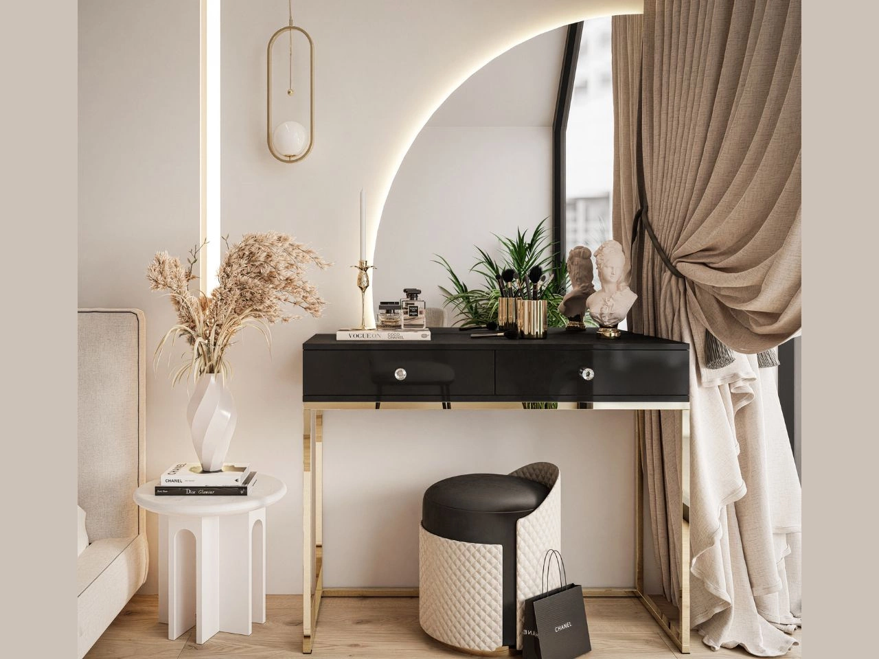 Suchen Sie ein Möbelstück, das Eleganz, Funktionalität und modernen Charakter vereint? Die Toilettentisch Clarette mit Spiegel und LED-Beleuchtung ist die ideale Lösung für alle, die minimalistisches Design und praktische Details schätzen. Ihre subtile Form und dekorative Verarbeitung machen sie perfekt für moderne, glamouröse oder skandinavische Einrichtungen und verleihen dem Raum einen einzigartigen Stil.