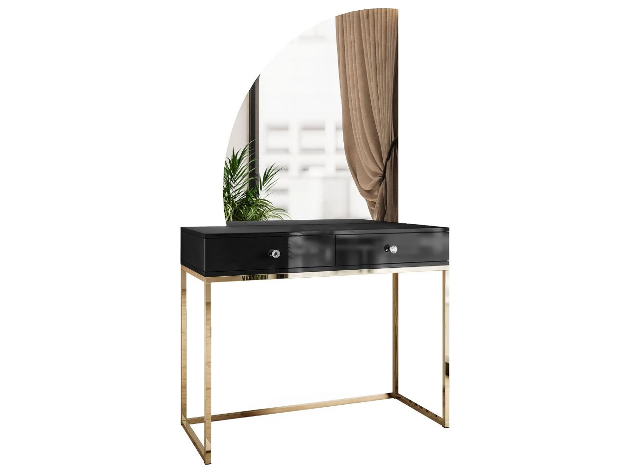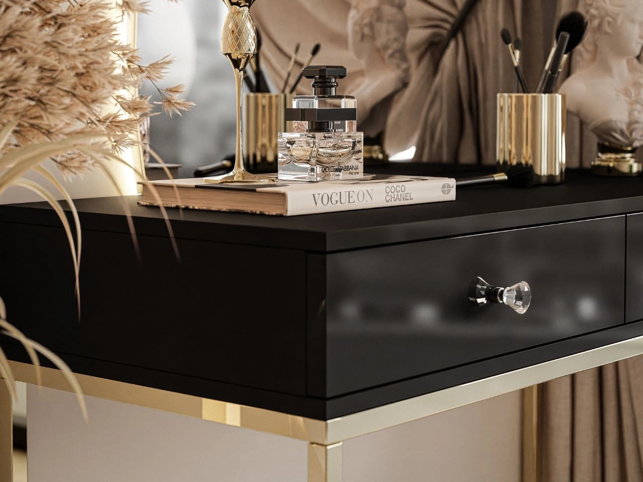 Kosmetiktisch linksseitig mit Schubladen und LED-Beleuchtung auf goldenen Beinen Clarette Schwarz Hochglanz