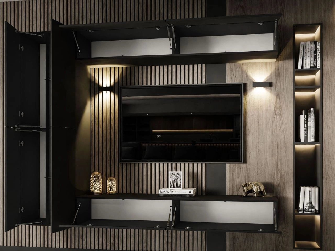 Du ziehst an: Hängende TV-Wohnwand mit LED-Beleuchtung für das Wohnzimmer Sorelle Schwarz Matt