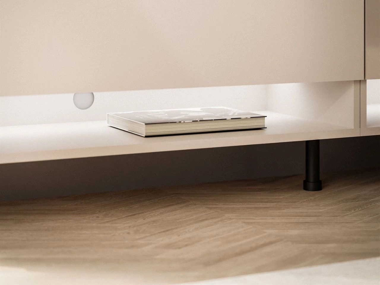 Der TV-Schrank Aurelie präsentiert sich in elegantem Kaschmir-Matt. Die matte Oberfläche von Fronten und Korpus verleiht dem Raum eine warme, einladende Ausstrahlung und fügt sich harmonisch in verschiedene Wohnstile ein. Die nach unten öffnende Front wird durch hochwertige Aktuatoren unterstützt, sodass sich das Möbelstück komfortabel bedienen lässt. Mit dem Push-to-Open-System genügt ein leichtes Antippen, um den Stauraum zu öffnen – ganz ohne Griffe und ohne den klaren, minimalistischen Look zu unterbrechen.
