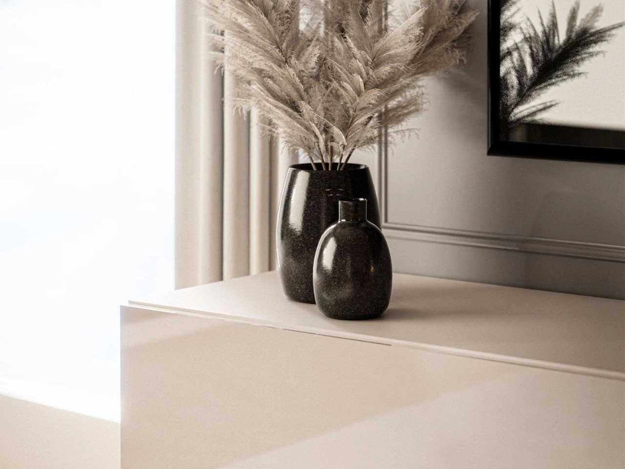 Die Fronten in edlem Kaschmir-Hochglanz spiegeln Eleganz und Exklusivität wider und setzen einen besonderen Akzent im Wohnbereich. Die nach unten öffnende Klappe, unterstützt von präzisen Aktuatoren, bietet komfortablen Zugang zum großzügigen Stauraum. Dank des innovativen Push-to-Open-System genügt ein sanftes Antippen, um die Front mühelos zu öffnen – ganz ohne Griffe.