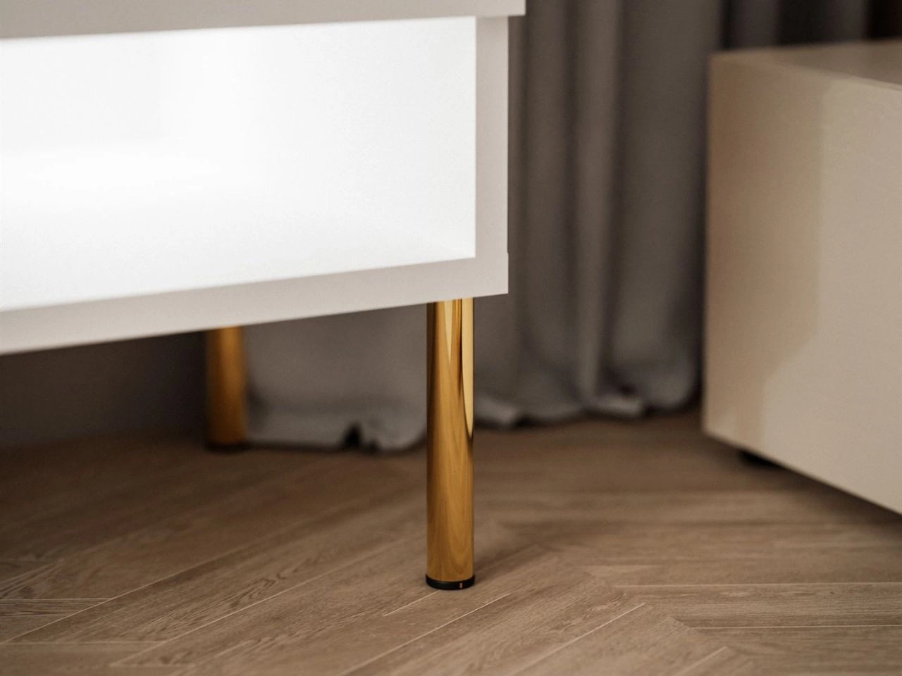 Goldene Metallbeine unterstreichen den modernen Charakter, während die LED-Beleuchtung in kühlem Weiß die klare Linienführung betont und dem Möbel einen exklusiven, fast schwebenden Look verleiht. Die Frontklappe öffnet sich sanft nach unten und dank Push-to-Open-System genügt ein leichtes Antippen – ganz ohne Griffe.