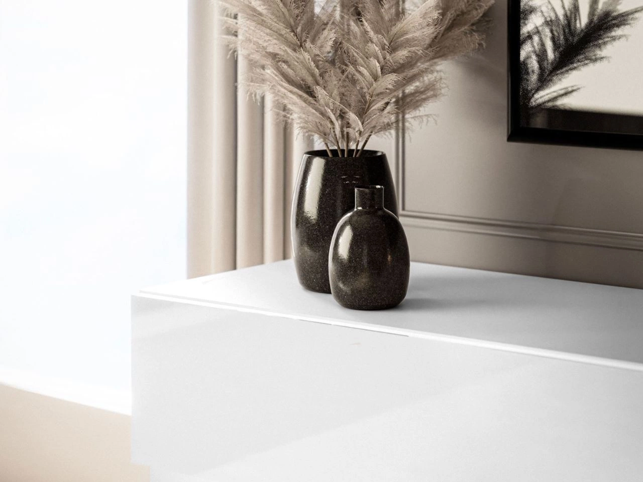 Wenn Sie von einem Wohnzimmer voller Stil und Eleganz träumen, wird dieses weiße TV-Lowboard zum Mittelpunkt Ihrer Einrichtung. Die Kombination aus Hochglanzfronten und einem matten Korpus spielt mit spannenden Kontrasten und verleiht dem Raum eine moderne Ausstrahlung sowie visuelle Leichtigkeit. Für täglichen Komfort sorgen innovative Funktionen – die nach unten öffnende Klappe bewegt sich dank integrierter Aktuatoren sanft und geräuschlos, während das Push-to-Open-System die Notwendigkeit von Griffen überflüssig macht. Ein leichter Druck genügt und der Stauraum für Multimediageräte öffnet sich sanft und mühelos.