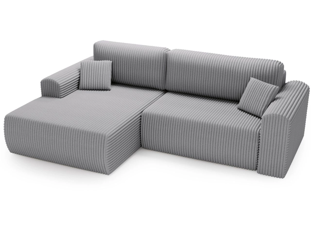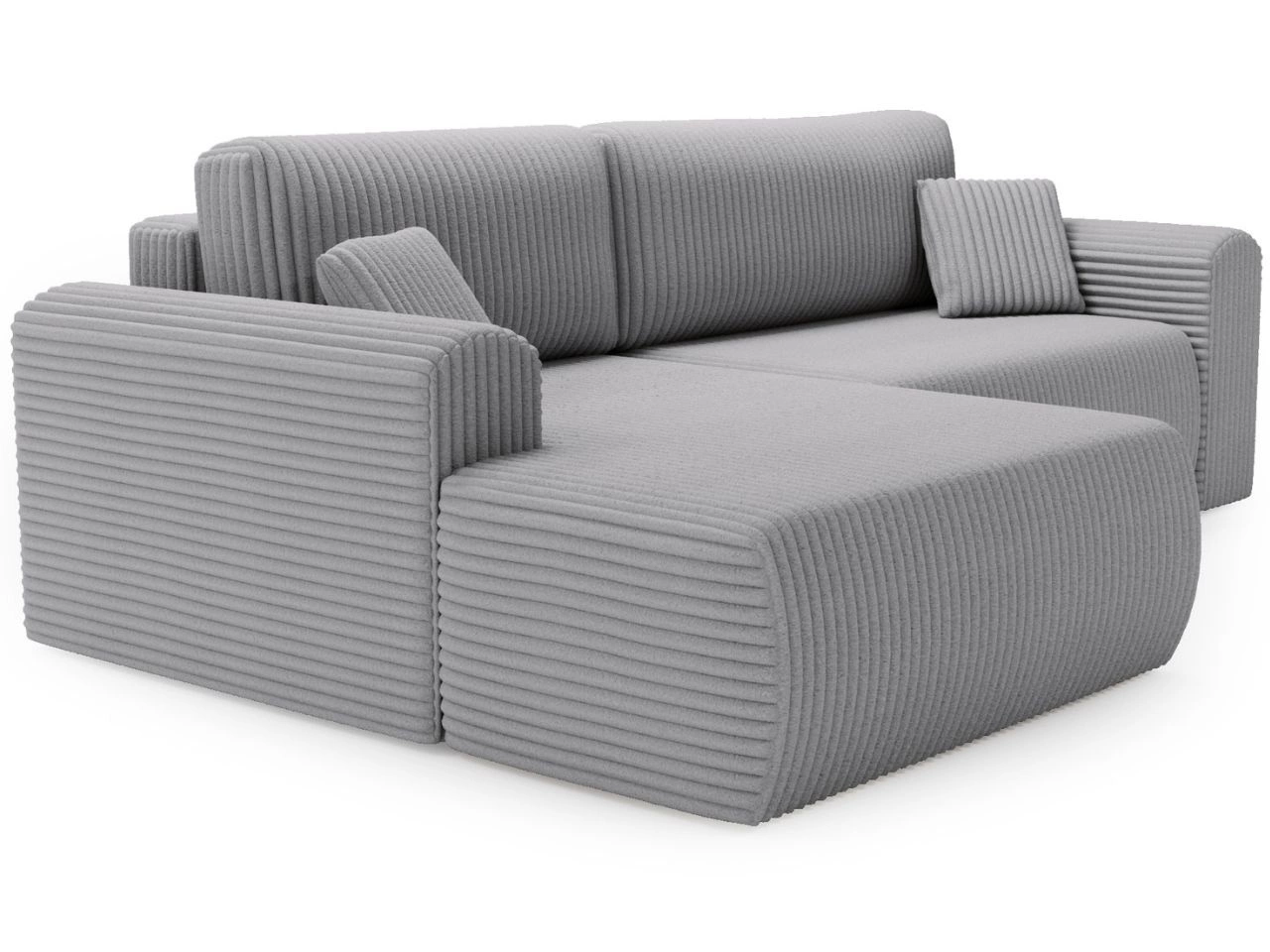 Ecksofa Belvio ist ein elegantes Polstermöbel, das modernes Design mit hoher Funktionalität verbindet. Die schlichte, geometrische Form wird durch sanft abgerundete Armlehnen ergänzt, was dem Sofa eine subtile Note verleiht. Der Bezug mit markanten, vertikalen Steppungen macht das Ecksofa zu einem besonderen Blickfang und passt perfekt in stilvolle Wohnräume.