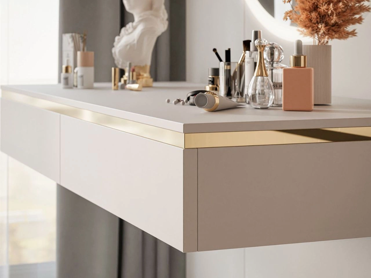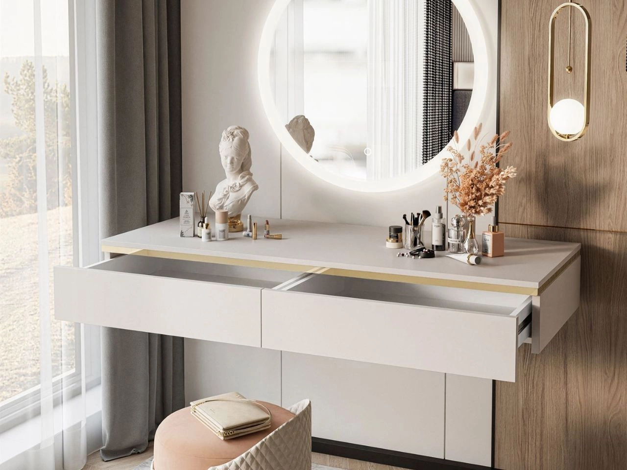 Funktionalität des Schminktisches Evare wird durch geräumige Schubladen unterstrichen, die sich unter der Tischplatte befinden und eine komfortable Aufbewahrung von Kosmetika, Schmuck und Accessoires ermöglichen. So bleibt alles Notwendige stets griffbereit und die Oberfläche ordentlich. Die hängende Konstruktion verleiht dem Möbelstück zudem Leichtigkeit und Modernität und lässt den Raum optisch größer wirken – eine ideale Lösung für kleine Schlafzimmer und Ankleidezimmer.