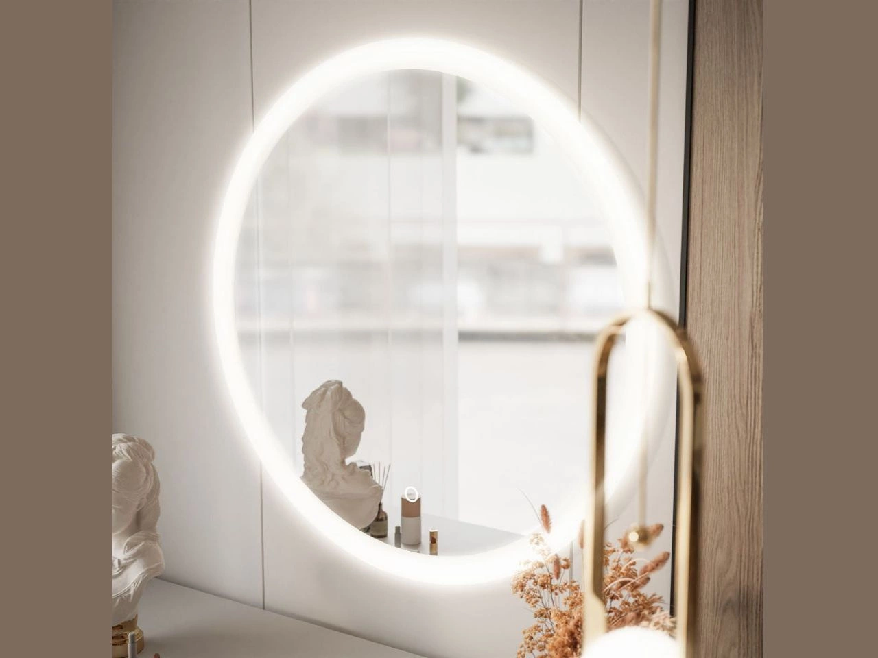 Modell Evare ist mit einem großen, runden Spiegel mit LED-Beleuchtung in neutraler Lichtfarbe ausgestattet. Diese praktische Lösung sorgt für ideale Bedingungen beim Schminken, Frisieren oder bei der täglichen Pflege. Der Spiegel erfüllt zudem eine dekorative Funktion, verleiht dem Möbelstück Eleganz und macht es zum zentralen Punkt des Schlafzimmers.