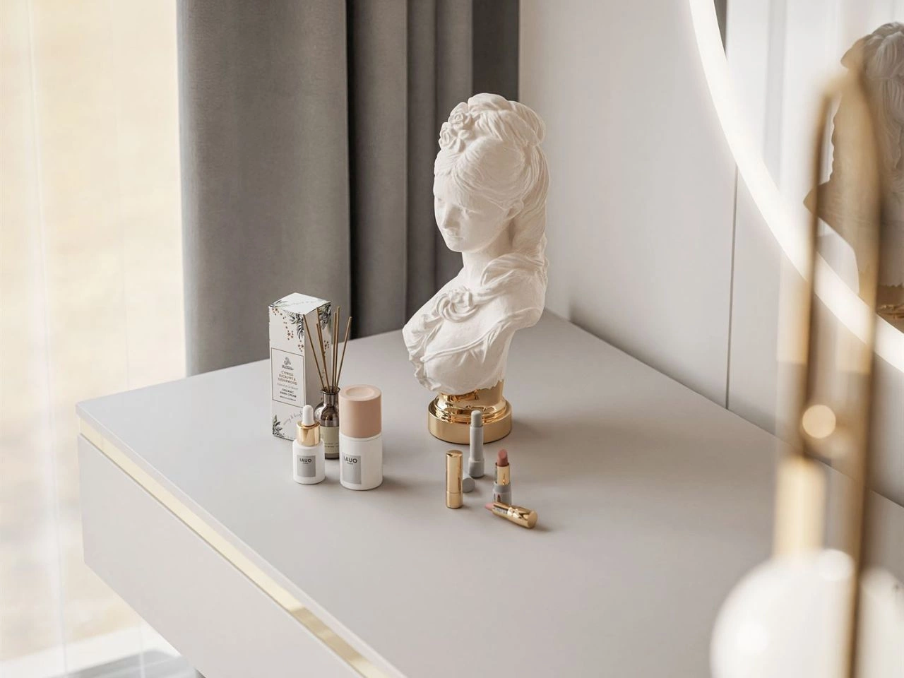 Konsole Evare ist ein elegantes und modernes Möbelstück, das sich perfekt in die Anforderungen zeitgemäßer Innenräume einfügt. Ihr minimalistisches Design, ergänzt durch subtile Details, verleiht dem Ganzen einen luxuriösen Charakter. Die Ausführung im Farbton Kaschmir bringt Harmonie und Leichtigkeit in den Raum, während der dekorative goldene Akzent den raffinierten Stil der Konsole unterstreicht.