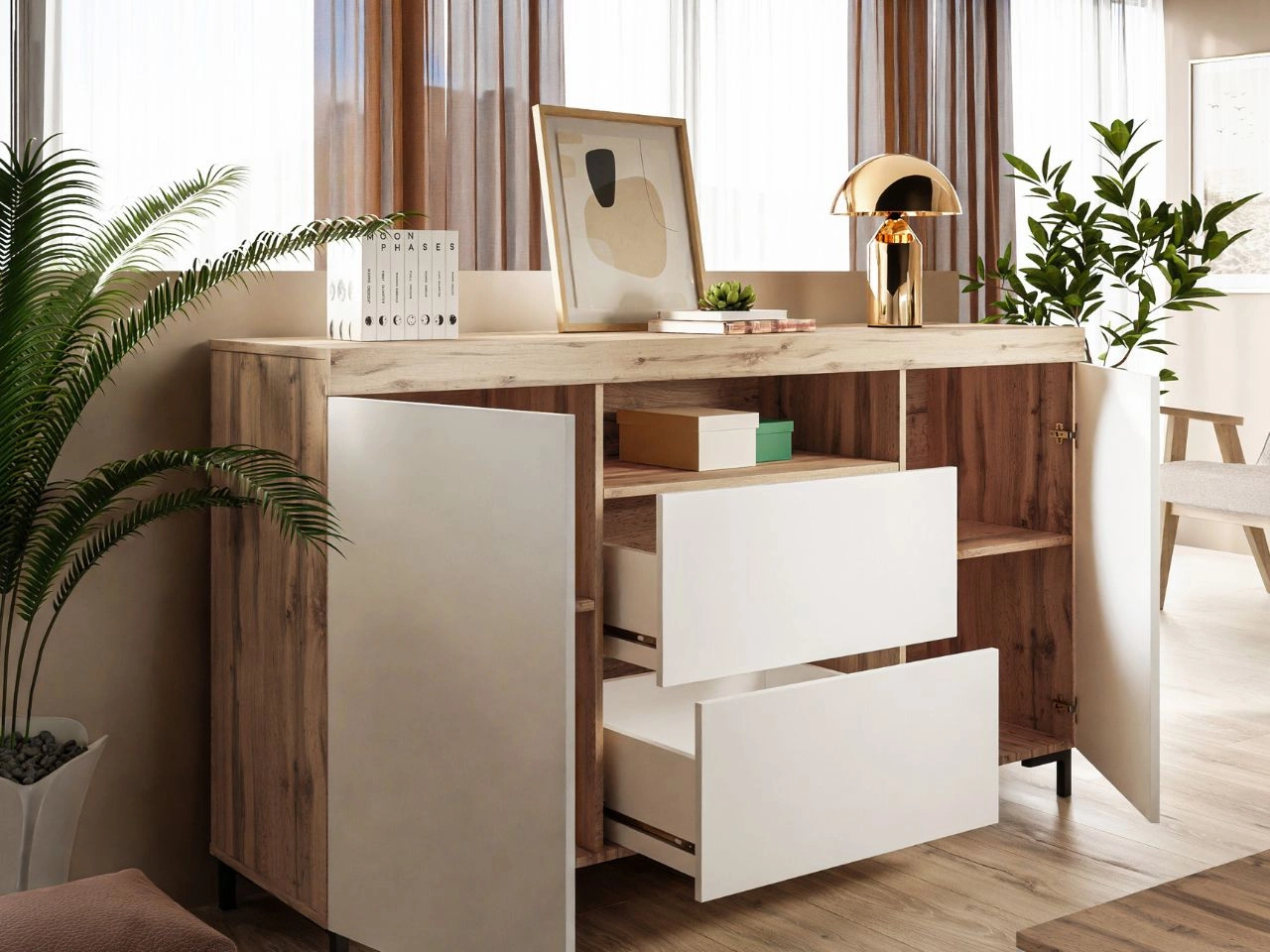 Das Möbelset Asumi, bestehend aus Kommode und TV-Schrank, bewährt sich nicht nur im Wohnzimmer, sondern auch im Schlafzimmer oder Jugendzimmer. Bereits die Farbkombination ist sehr interessant: weiße Fronten kontrastieren hervorragend mit dem Korpus in Eiche Wotan. Die Möbel sind aus hochwertiger, laminierter Platte gefertigt; die Kanten sind mit ABS beschichtet, was vor kleinen mechanischen Beschädigungen schützt und das Eindringen von Feuchtigkeit verhindert.