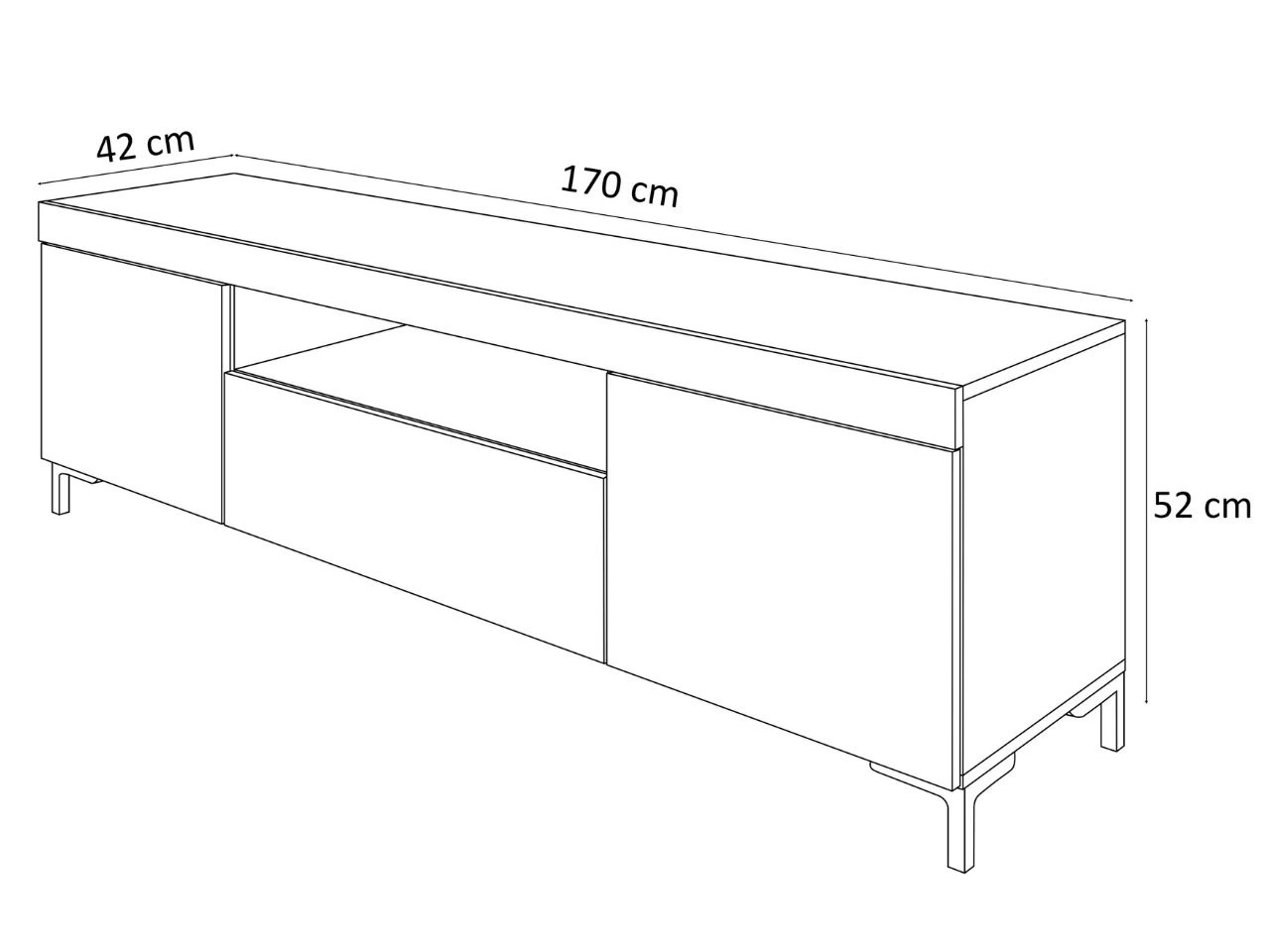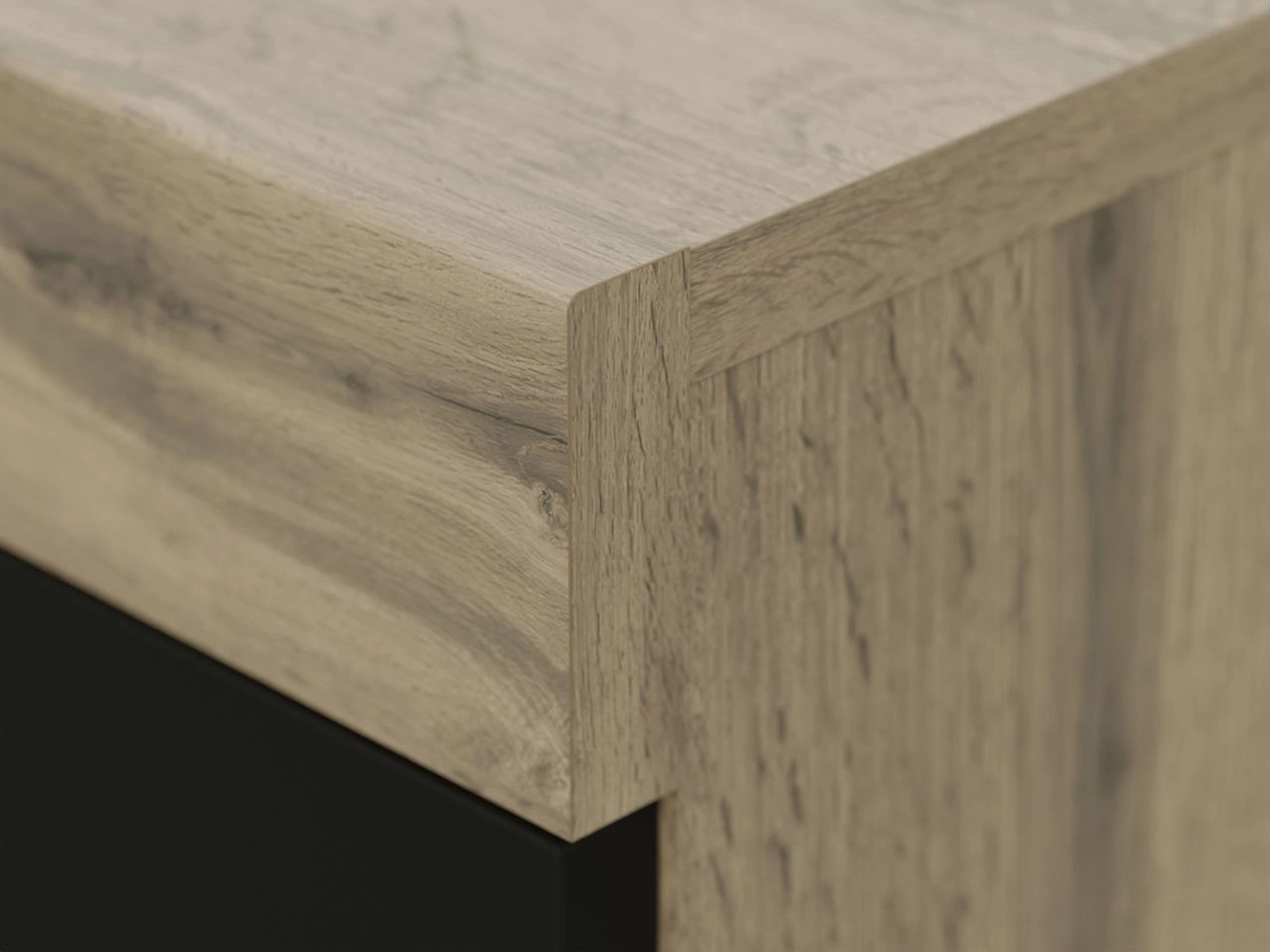 Sowohl die Kommode als auch der TV-Schrank verfügen über zwei Klappen und eine Schublade (bei der Kommode sind es zwei Schubladen), die auf Kugelführungen laufen und einen Vollauszug ermöglichen. Außerdem gibt es ein offenes Fach für Multimedia-Geräte. In den Schränken der Kommode befindet sich jeweils ein zusätzliches, praktisches Einlegeboden. Das Öffnen der Türen und Schubladen erfolgt über das grifflose System Push To Open – drücken zum Öffnen.