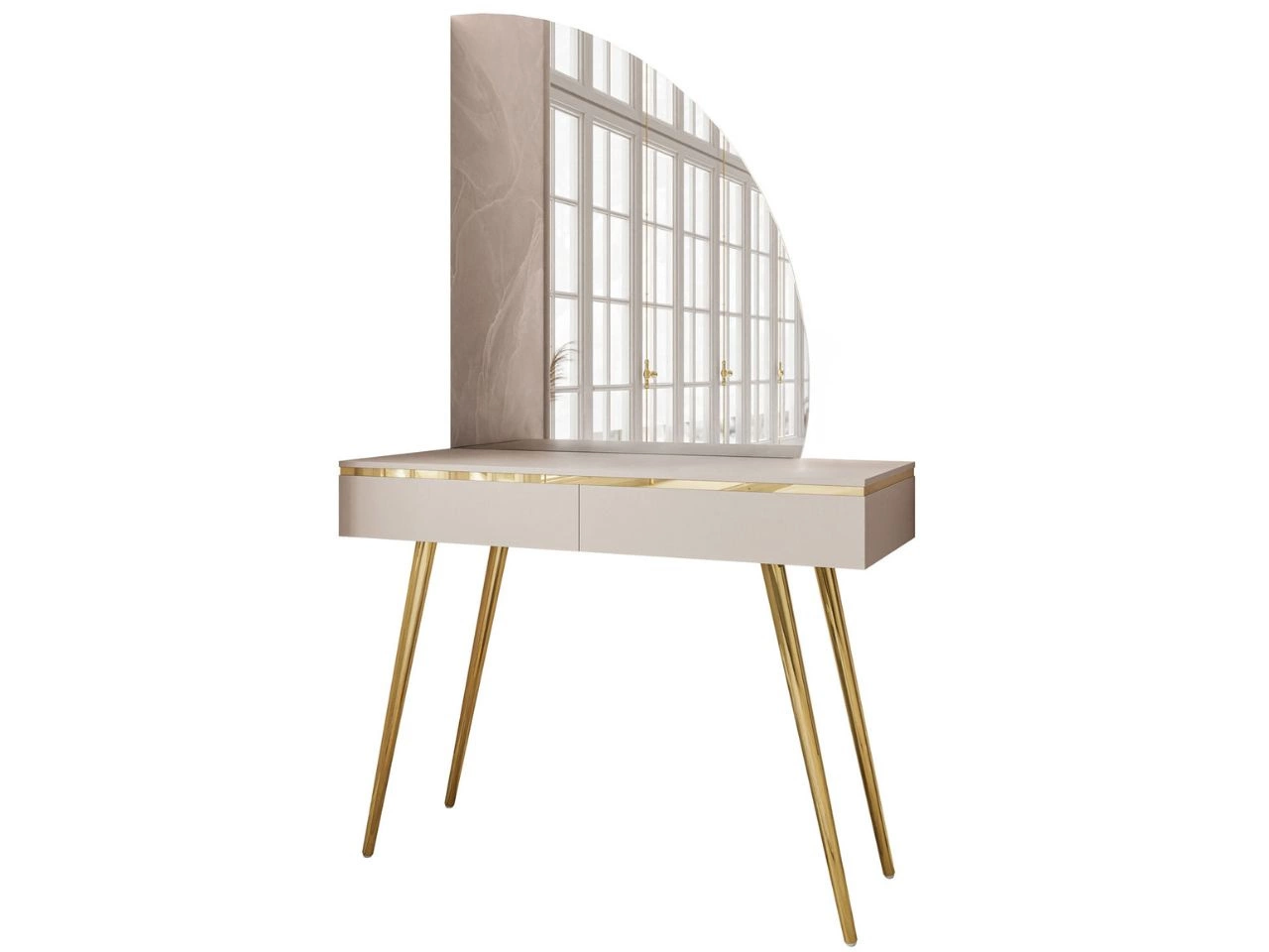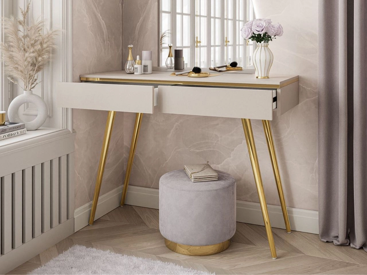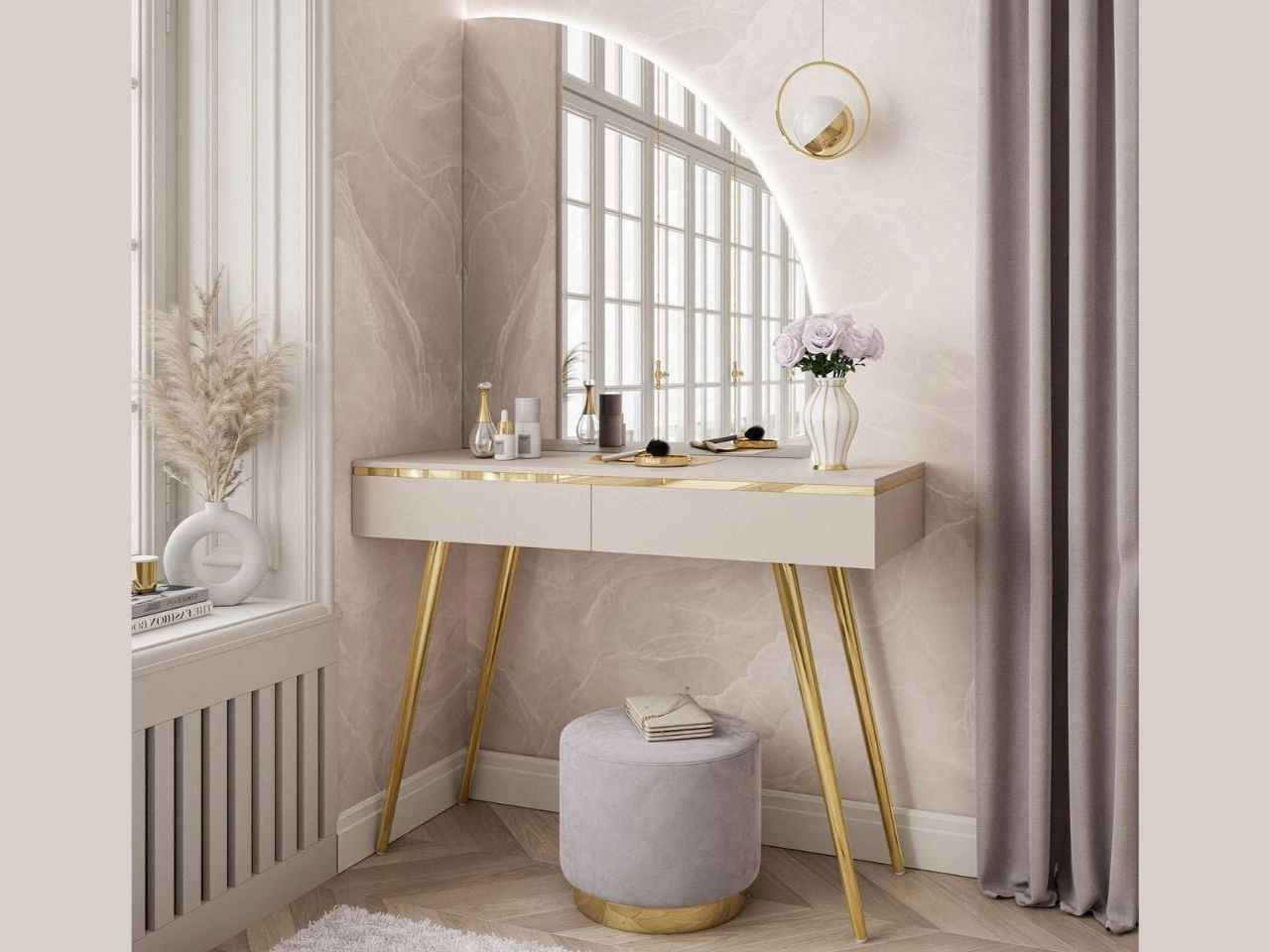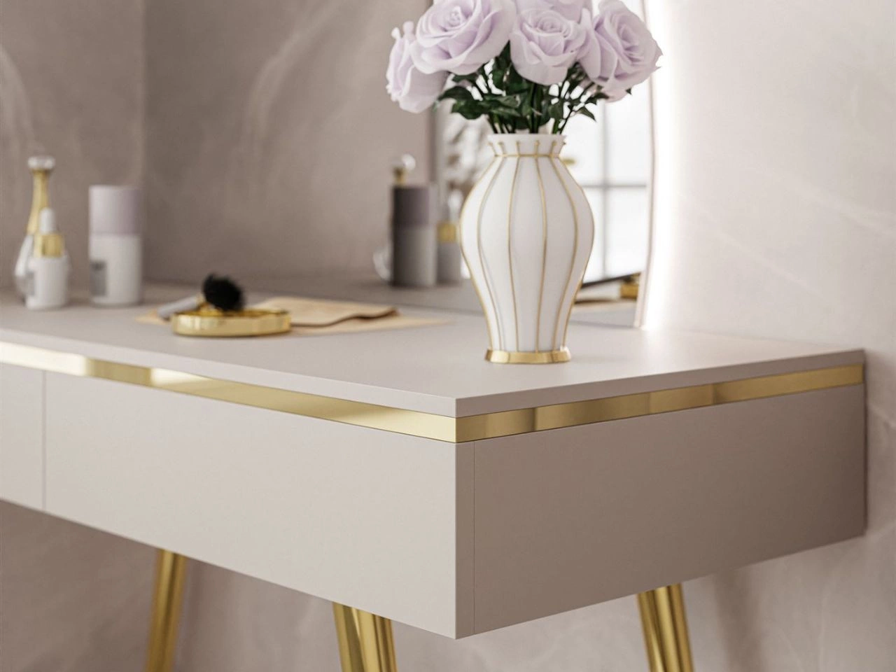 Schminktisch Evare ist ein elegantes und funktionales Möbelstück, das perfekt auf die Bedürfnisse moderner Innenräume abgestimmt ist. Die schlanke Form im Farbton Kaschmir wirkt dezent und stilvoll, während das dekorative goldene Zierband rund um die Tischplatte dem Ganzen einen luxuriösen Charakter verleiht. Dank seines universellen Designs passt dieses Modell sowohl in klassische als auch in minimalistische Einrichtungen und verleiht ihnen eine raffinierte Note.