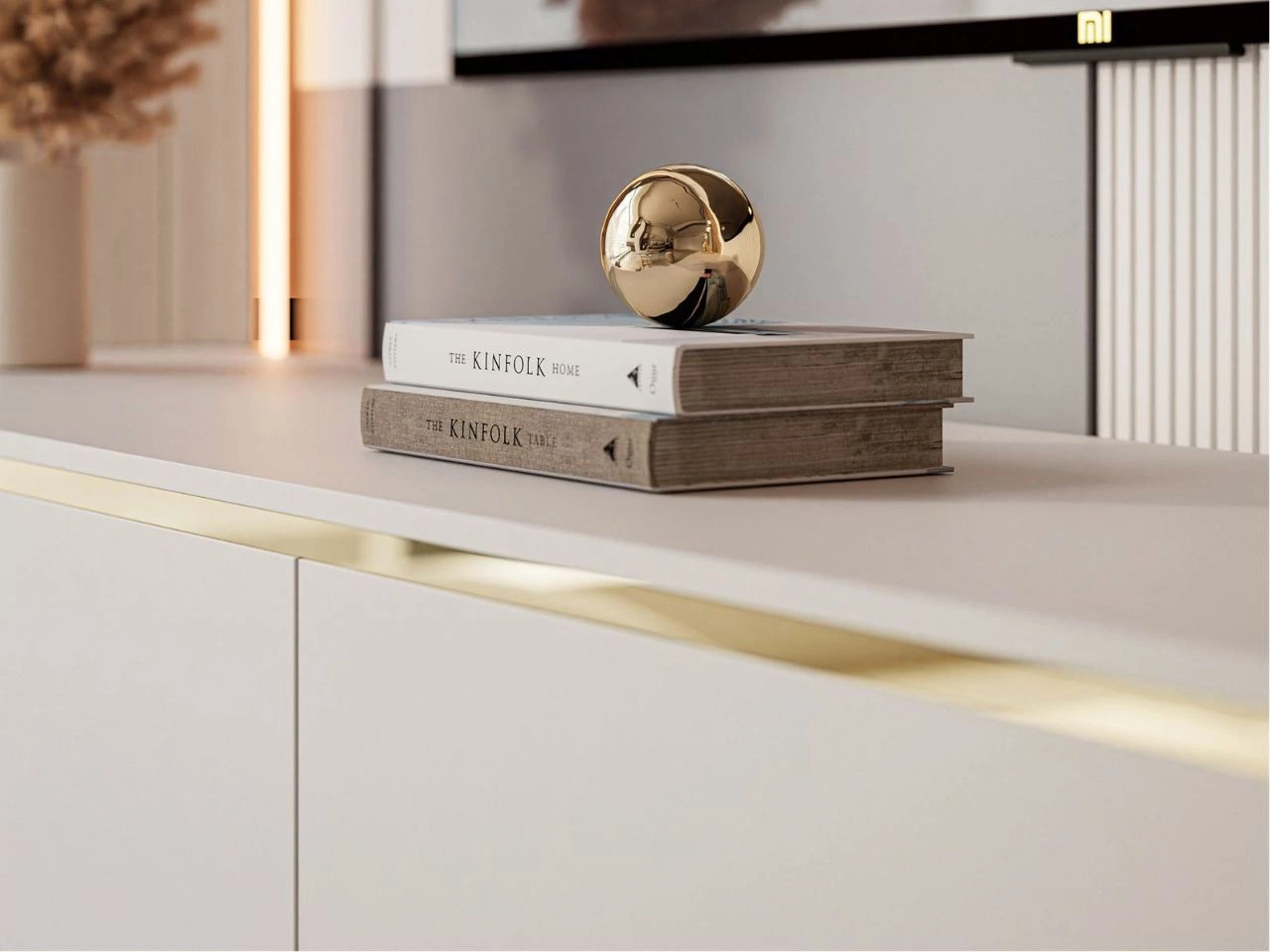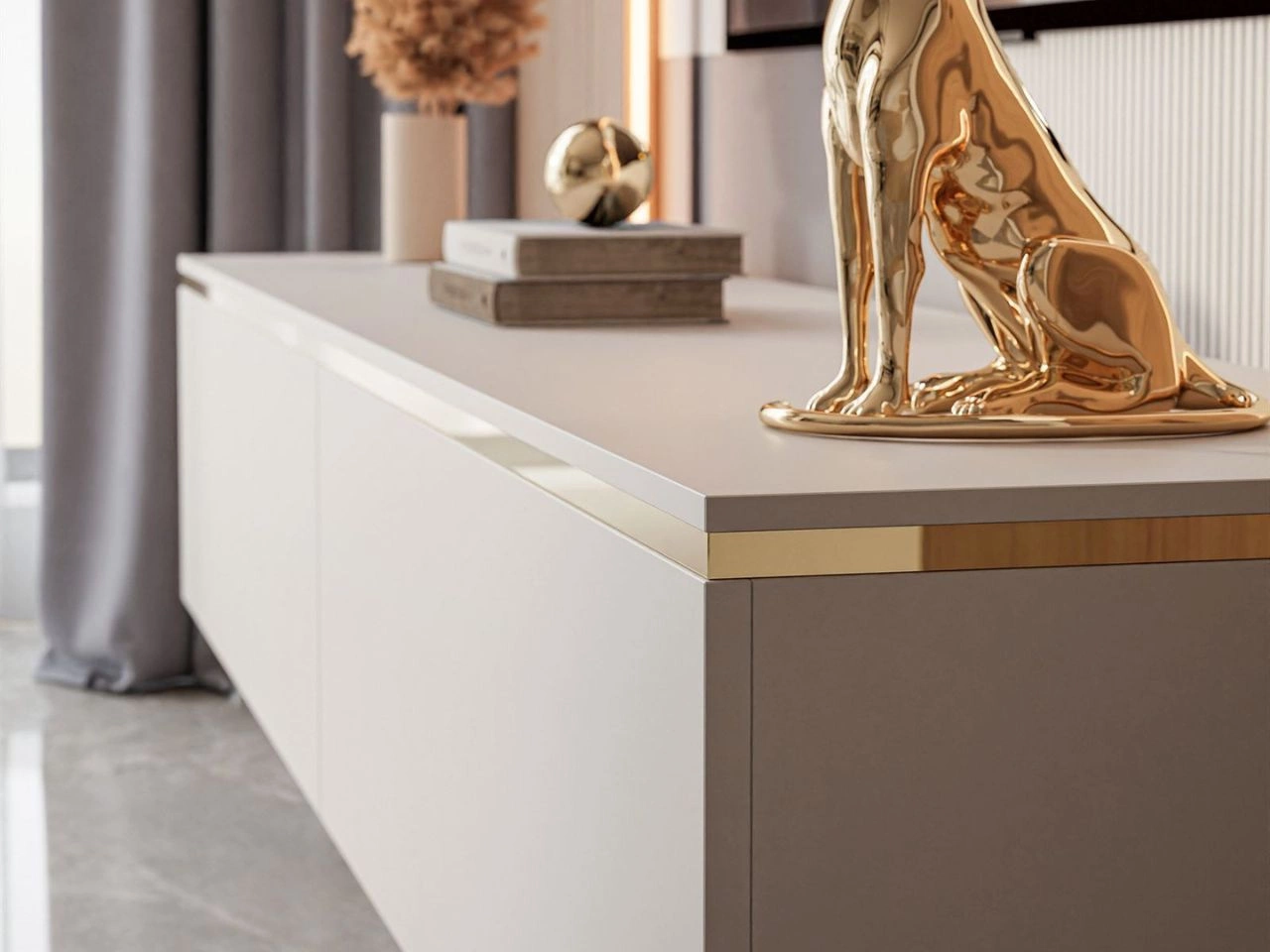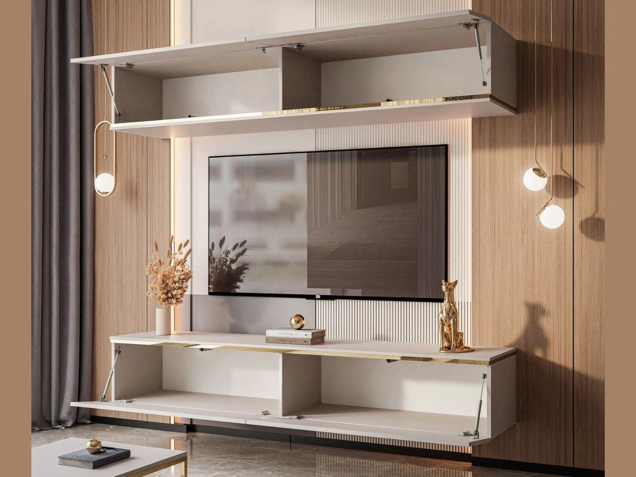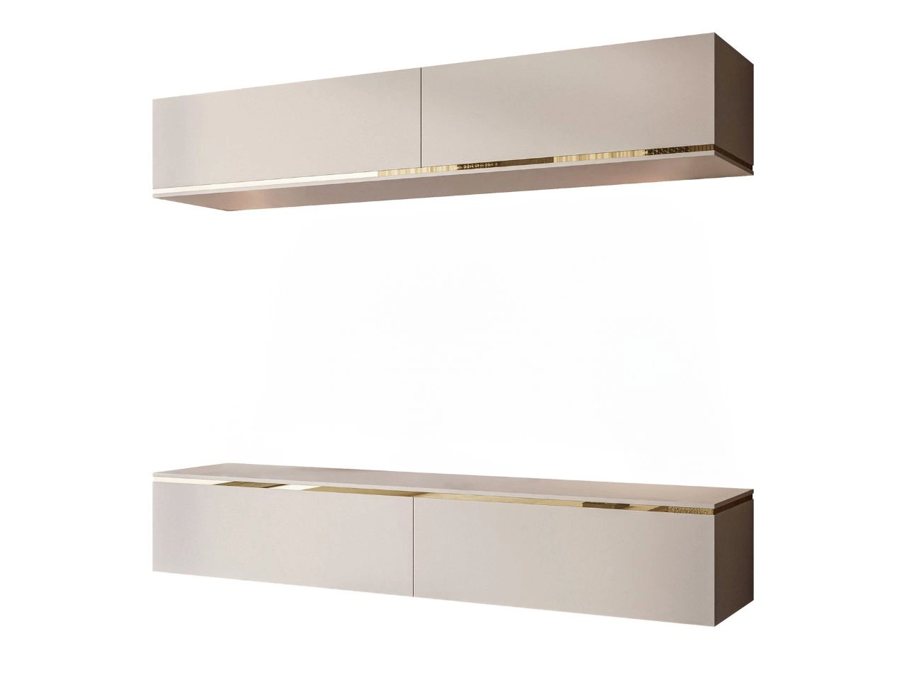Fronten im trendigen Farbton Kashmir wirken dezent und elegant, während das dekorative goldene Band den exklusiven Stil des gesamten Sets unterstreicht. Die Wohnwand umfasst geräumige Hängeschränke oben und unten, die ausreichend Platz für Zubehör, Dokumente oder Multimediageräte bieten. So lässt sich Ordnung leicht halten, während gleichzeitig Dekorationen und Einrichtungselemente zur Geltung kommen.