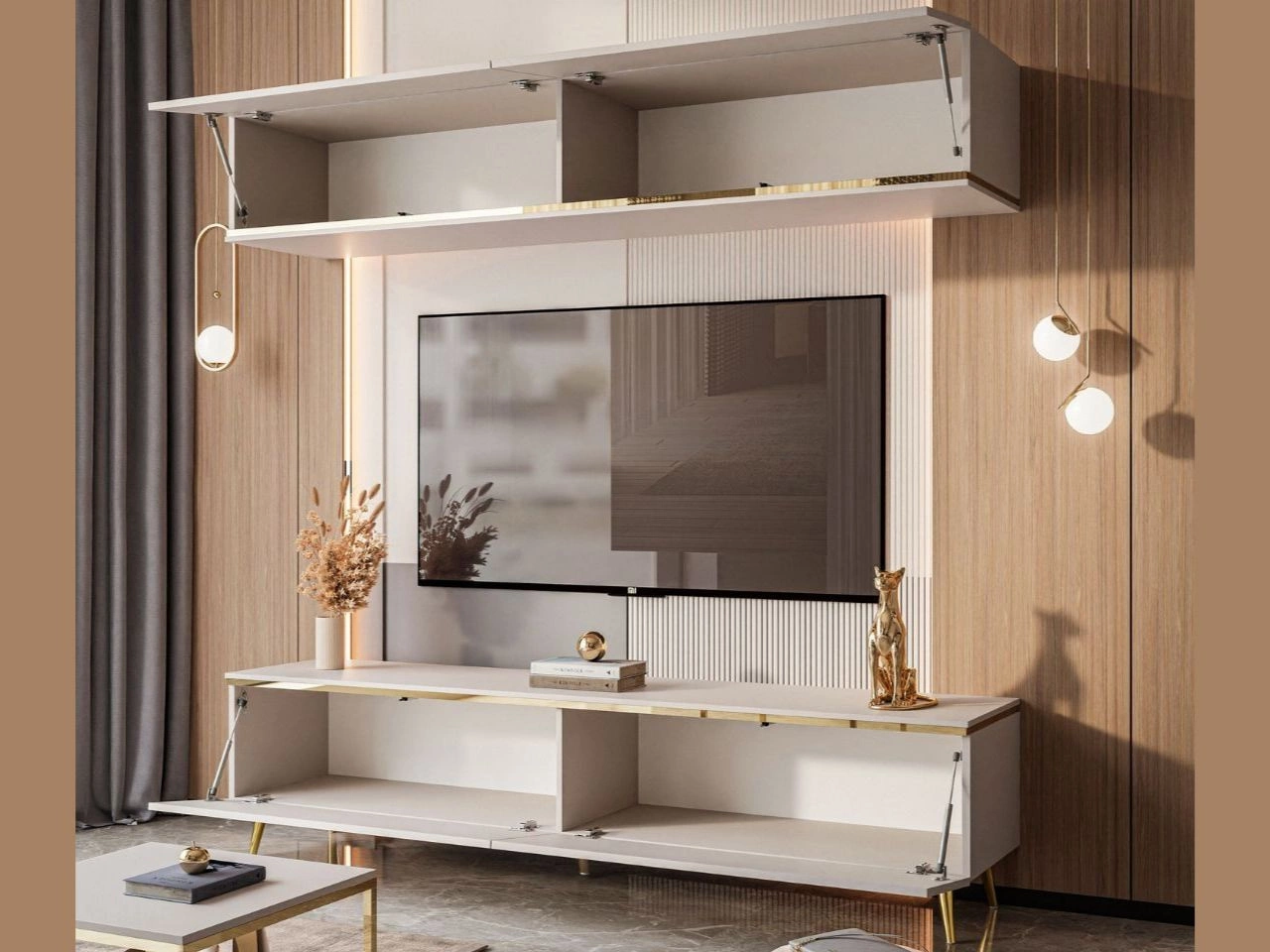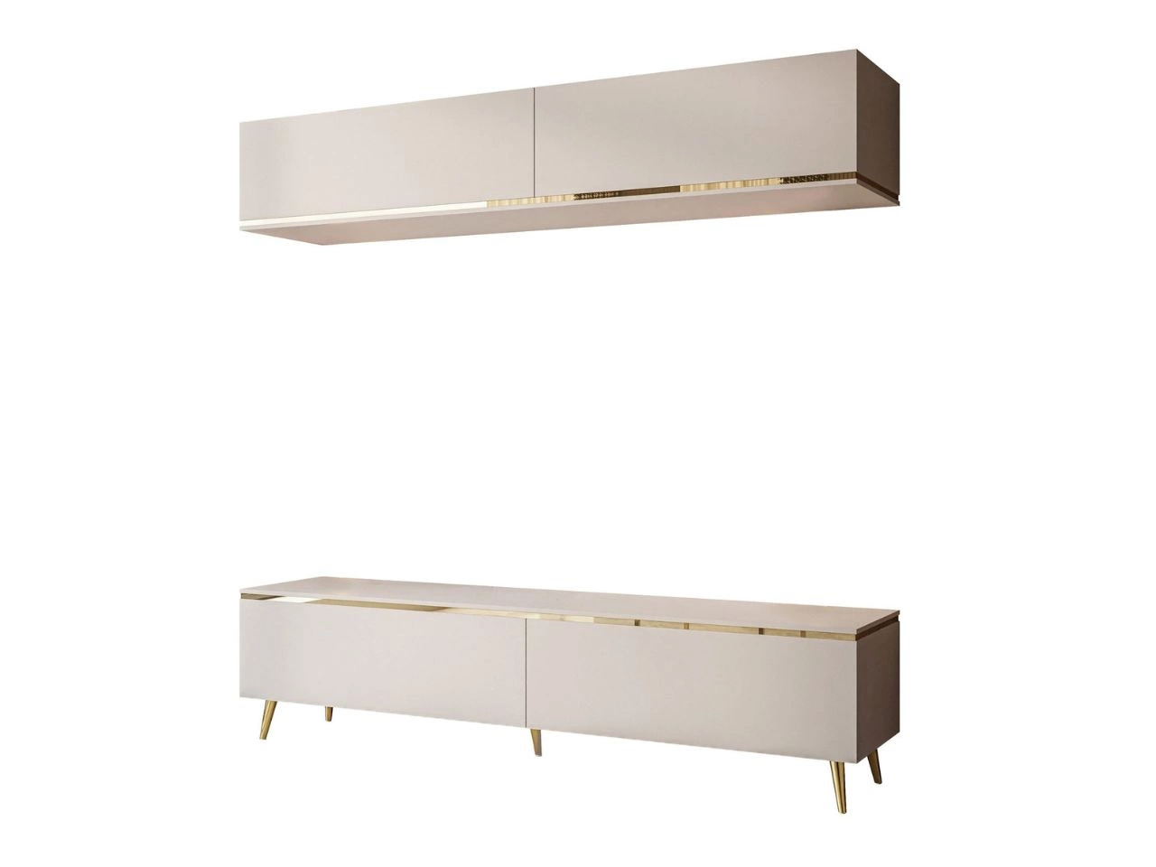 Fronten im modernen Farbton Kaschmir wirken dezent und elegant, während der dekorative goldene Streifen den exklusiven Stil des gesamten Sets betont. Die Wohnwand umfasst geräumige obere und untere Schränke, die ausreichend Platz für die Aufbewahrung von Accessoires, Dokumenten oder Multimedia-Geräten bieten. So bleibt Ordnung im Raum gewahrt, während Dekorationen und Wohnaccessoires stilvoll zur Geltung kommen.