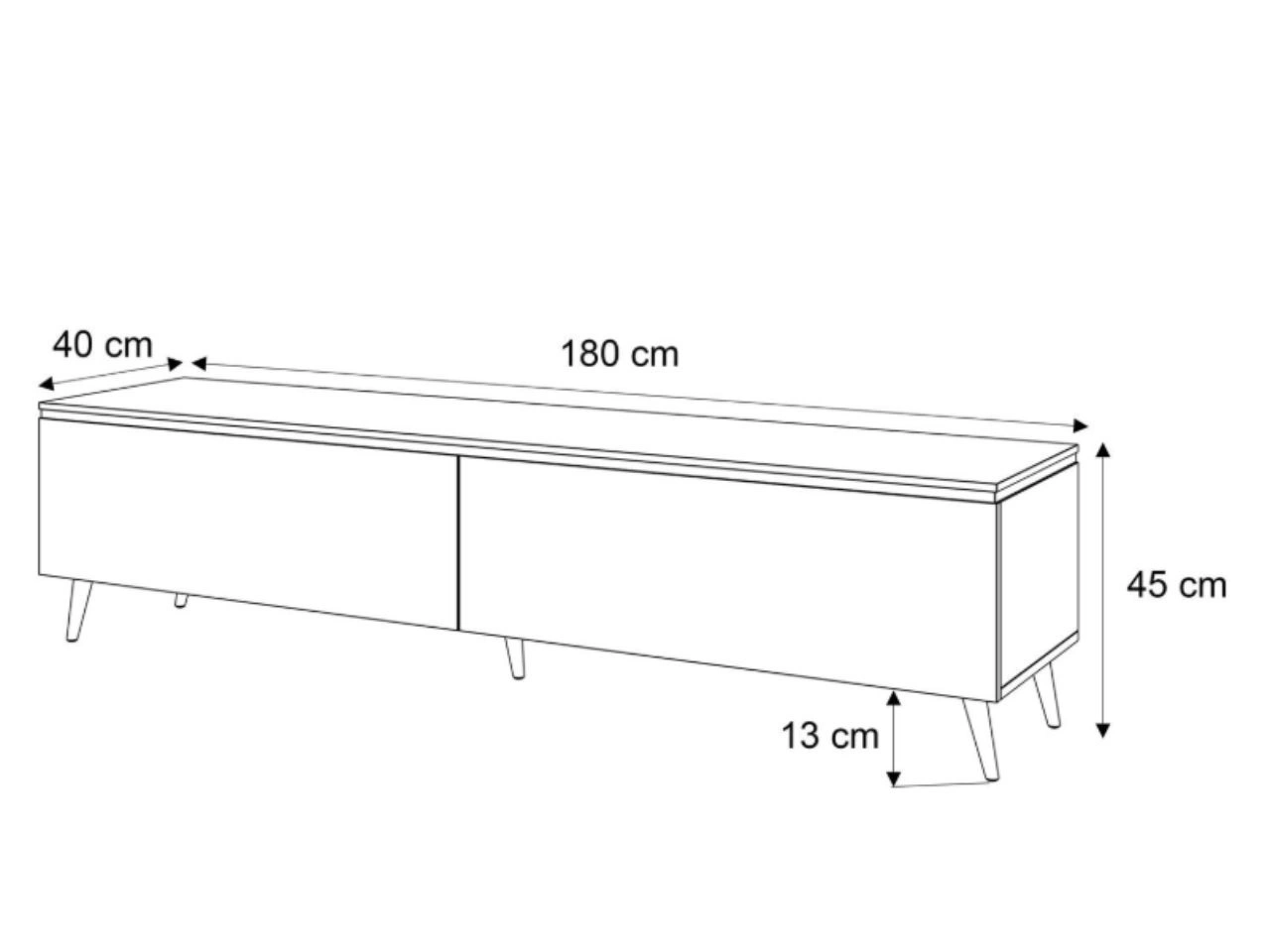 Gesamte Set besteht aus einer robusten laminierten Platte, deren Kanten mit widerstandsfähigem ABS-Kantenband geschützt sind. Die Konstruktion steht auf schräge, goldenen Metallbeinen, die ihr Leichtigkeit, Eleganz und einen modernen Charakter verleihen. Die Wohnwand Evare ist die ideale Wahl für alle, die Ästhetik mit alltäglichem Komfort verbinden möchten.