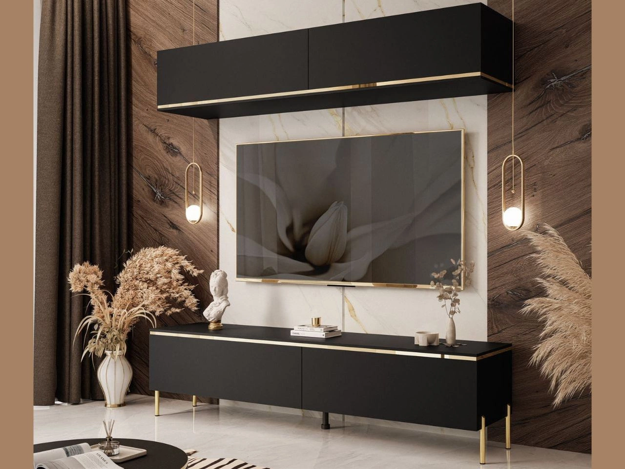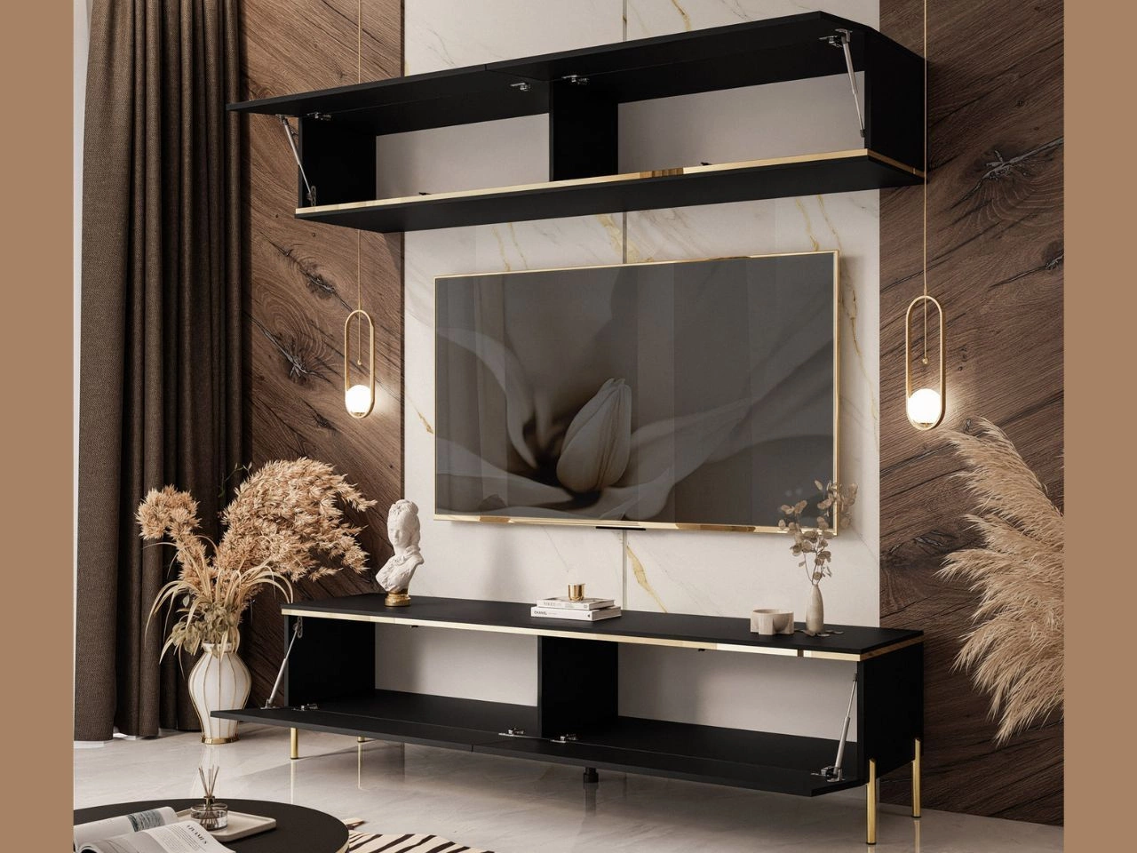 Fronten im modernen Farbton schwarz wirken dezent und elegant, während der dekorative goldene Streifen den exklusiven Stil des gesamten Sets betont. Die Wohnwand umfasst geräumige obere und untere Schränke, die ausreichend Platz für die Aufbewahrung von Accessoires, Dokumenten oder Multimedia-Geräten bieten. So bleibt Ordnung im Raum gewahrt, während Dekorationen und Wohnaccessoires stilvoll zur Geltung kommen.