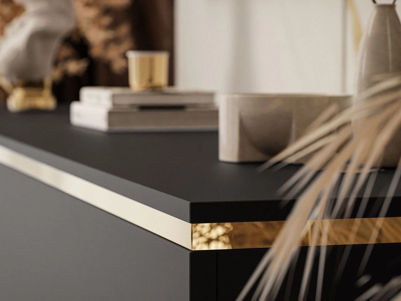 Der TV-Schrank Evare in Schwarz-Matt vereint modernes Design mit praktischer Alltagstauglichkeit. Die matte Oberfläche in tiefem Schwarz bringt eine ruhige Eleganz in den Wohnraum, während die feine Umrandung in Gold für einen stilvollen, luxuriösen Akzent sorgt. Getragen wird der Schrank von schlichten, goldfarbenen Metallbeinen, die ihm Leichtigkeit und Stabilität verleihen. Dank robuster Laminatplatte und schützenden ABS-Kanten bleibt die Oberfläche dauerhaft widerstandsfähig. Das grifflose Push-to-Open-System unterstreicht das klare, minimalistische Erscheinungsbild und sorgt für höchsten Bedienkomfort.