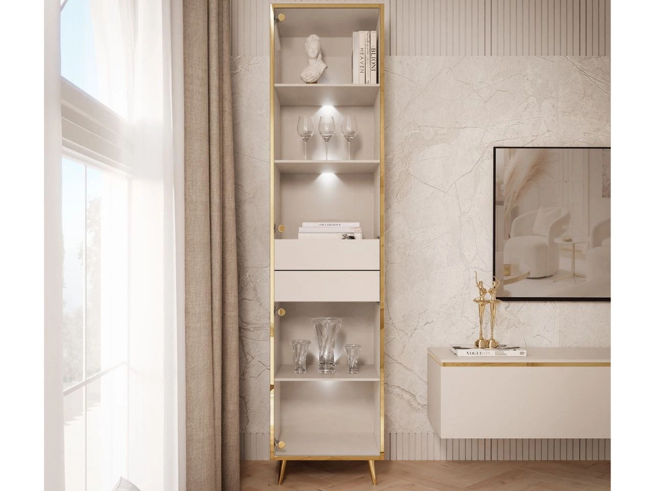 Die Vitrine Evare ist ein schönes Möbelstück mit minimalistischem Design. Sofort ins Auge fällt die goldene Zierleiste, die die Front vollständig einfasst. Dieses Detail – ebenso wie die goldenen Scharniere – verweist direkt auf den Glamour-Stil. Es gibt zwei Paare transparenter Türen aus gehärtetem Glas. Die Türen sind universell und können sowohl links als auch rechts montiert werden. Das Öffnen erfolgt per grifflosem Push-To-Open-System. Zum Öffnen drücken. Auf die gleiche Weise erhält man Zugang zu zwei Schubladen.