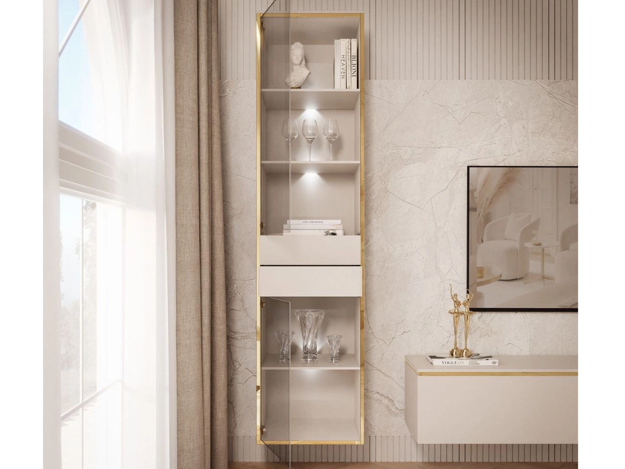 Die hängende Vitrine Evare ist ein schönes Möbelstück mit minimalistischem Design. Sofort ins Auge fällt die goldene Zierleiste, die die Front vollständig einfasst. Dieses Detail – ebenso wie die goldenen Scharniere – verweist direkt auf den Glamour-Stil. Es gibt zwei Paare transparenter Türen aus gehärtetem Glas. Die Türen sind universell und können sowohl links als auch rechts montiert werden. Das Öffnen erfolgt per grifflosem Push-To-Open-System. Zum Öffnen drücken. Auf die gleiche Weise erhält man Zugang zu zwei Schubladen.