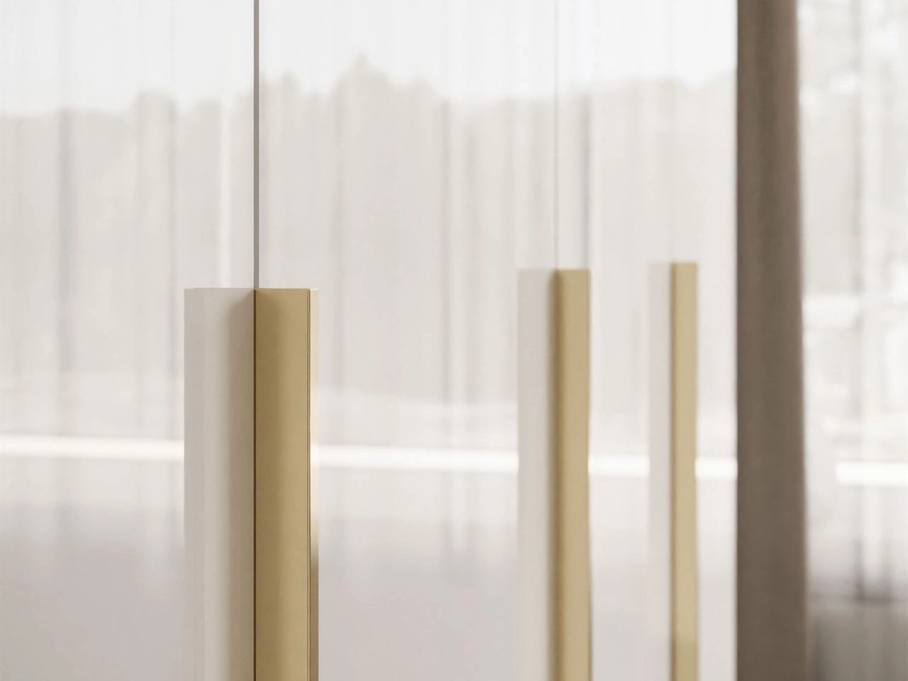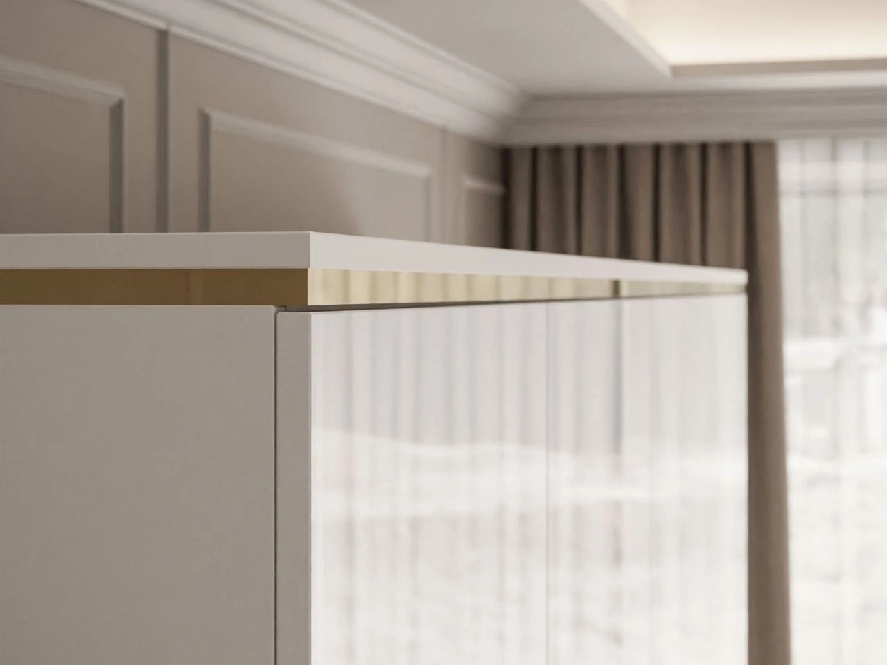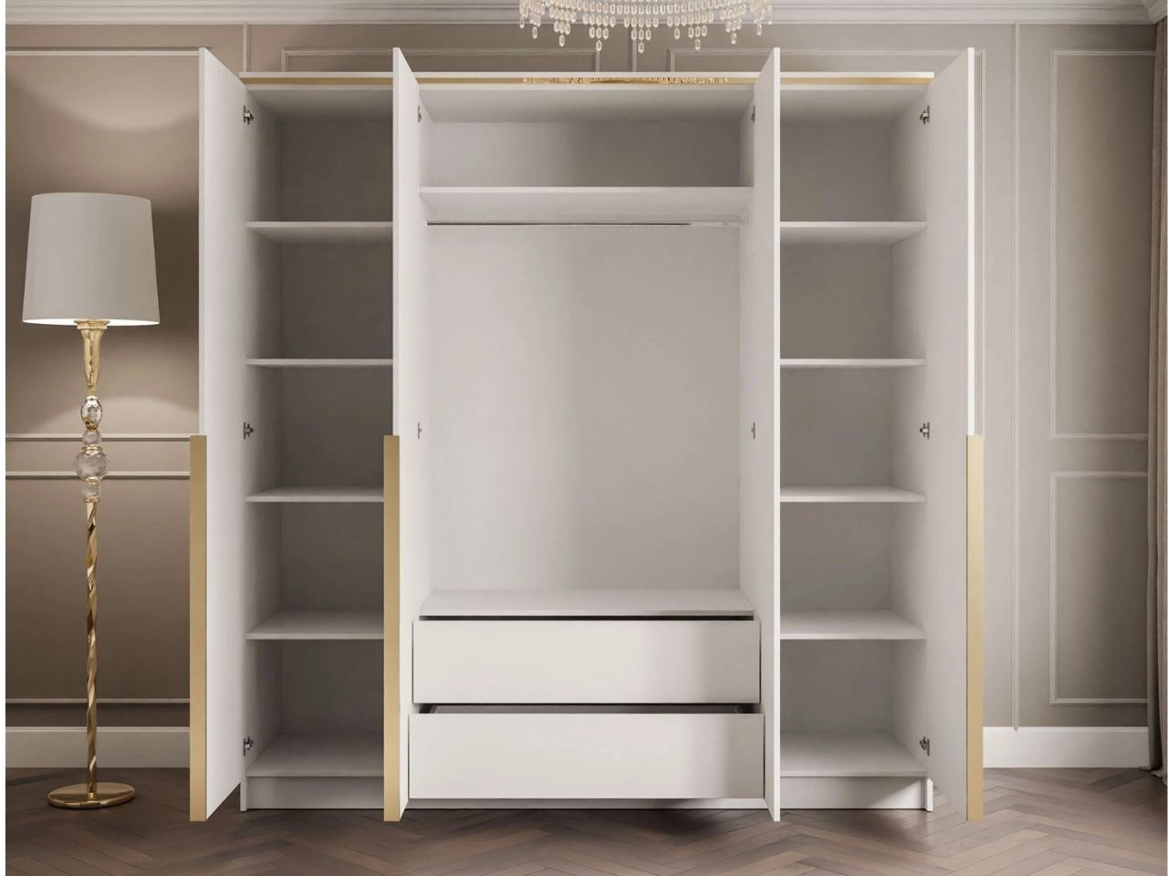 Gefertigt aus hochwertiger Laminatplatte, überzeugt der Schlafzimmerschrank durch Stabilität und Langlebigkeit. Die Fronten in Weiß Hochglanz spiegeln das Licht und verleihen dem Möbelstück einen luxuriösen, modernen Charakter, während der matte Korpus einen harmonischen Kontrast schafft. Dekorative Goldkanten und verlängerte Griffe setzen stilvolle Akzente, während ABS-Kanten die Oberfläche zuverlässig vor Kratzern und mechanischen Beschädigungen schützen.