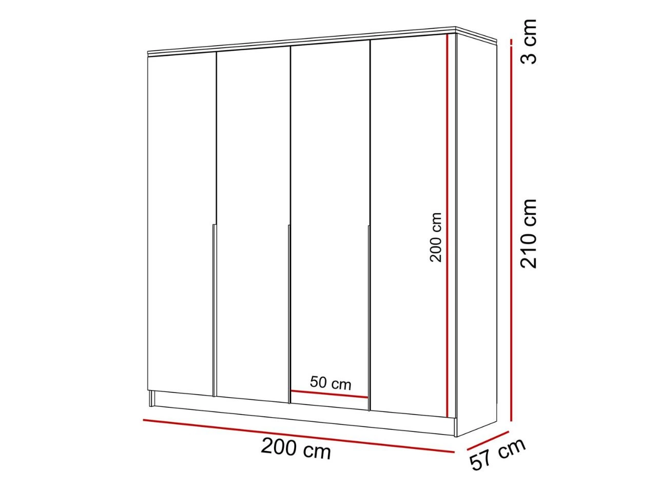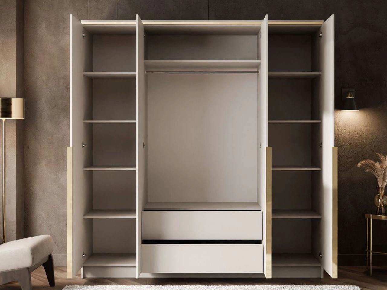 Viertürige Schrank bietet reichlich Platz für Kleidung, Accessoires und persönliche Gegenstände. Im Inneren befinden sich zwei funktionale Schubladen auf Kugelführungen mit Vollauszug, die höchsten Bedienkomfort gewährleisten. Neun geräumige Regalfächer erleichtern die Organisation der Garderobe, und eine Kleiderstange sorgt für die praktische Aufbewahrung von Hängekleidung. Die goldenen Griffe erleichtern nicht nur die tägliche Nutzung, sondern stellen auch ein dekoratives Detail dar, das den Schrank von anderen Modellen abhebt.