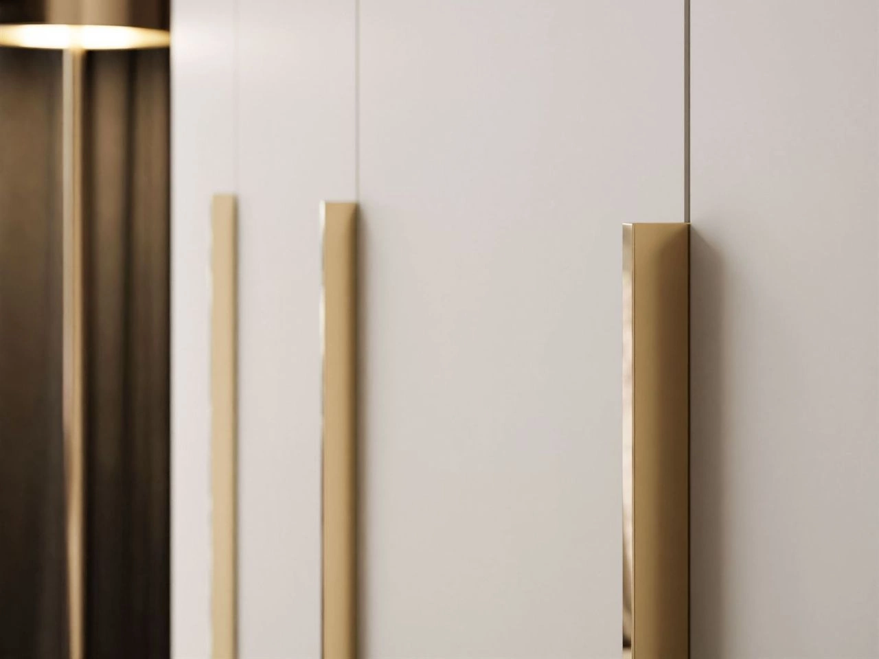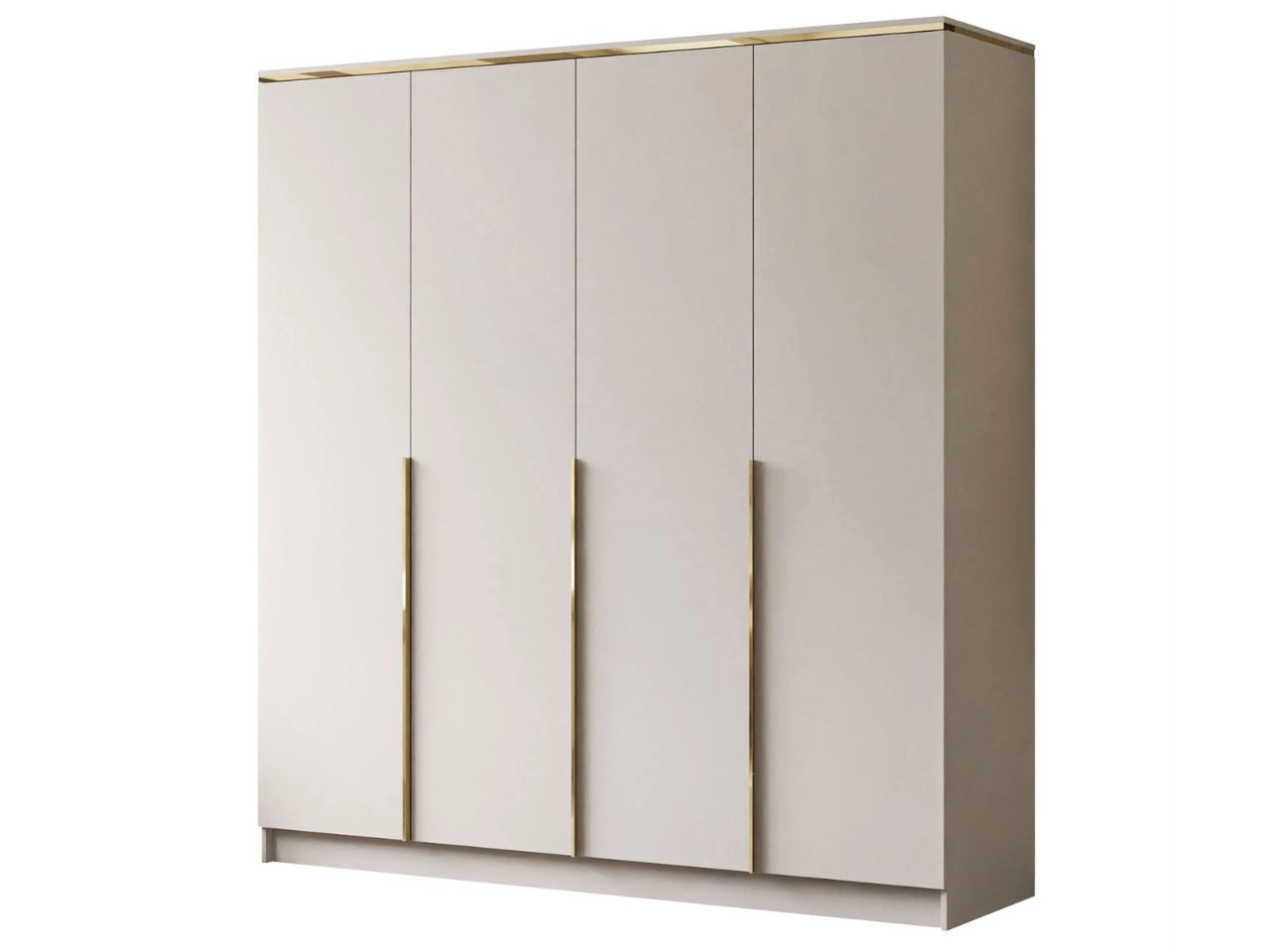 Drehtürenschrank Evare in Kaschmir vereint modernes Design mit maximaler Funktionalität und eignet sich perfekt für das Schlafzimmer oder die Ankleide. Matte Fronten und Korpus bilden eine harmonische Einheit, während der dekorative goldene Zierstreifen und die langen, vertikalen Griffe den luxuriösen Charakter des Möbelstücks unterstreichen und dem Raum besondere Eleganz verleihen.
