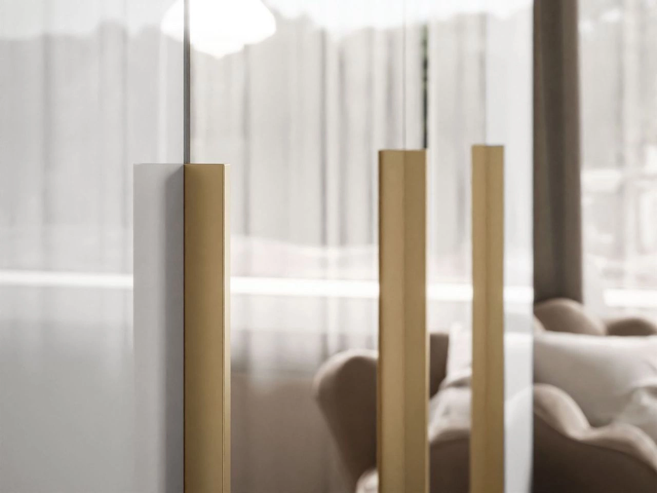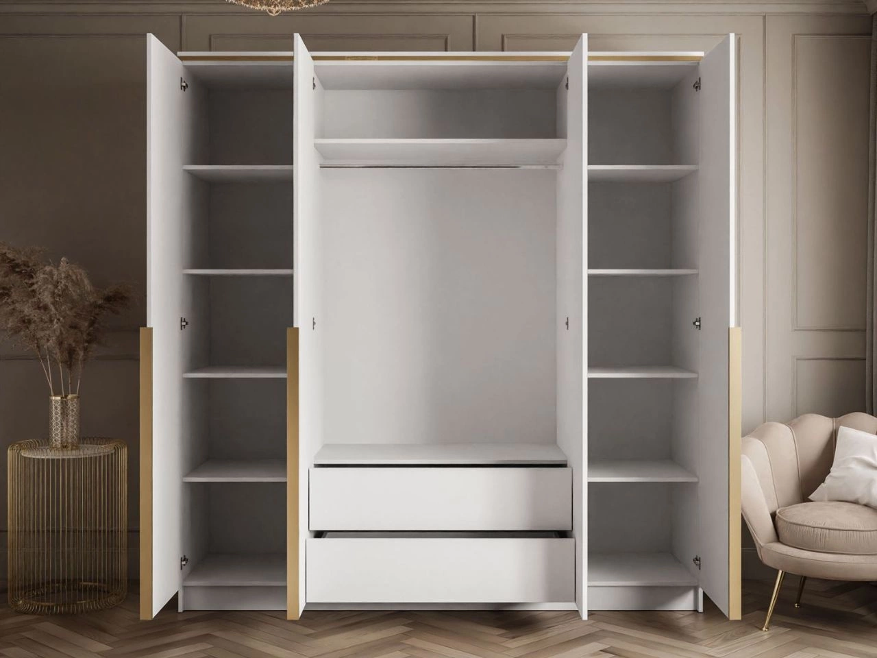 Gefertigt aus hochwertiger Laminatplatte, überzeugt der Schlafzimmerschrank durch Stabilität und Langlebigkeit. Die Fronten in Weiß Hochglanz spiegeln das Licht und verleihen dem Möbelstück einen luxuriösen, modernen Charakter, während der matte Korpus einen harmonischen Kontrast schafft. Zwei spiegelnde Fronten erweitern optisch den Raum, bringen Helligkeit in das Interieur und verbinden praktischen Nutzen mit einem Hauch von Eleganz. Dekorative Goldkanten und verlängerte Griffe setzen stilvolle Akzente, während ABS-Kanten die Oberfläche zuverlässig vor Kratzern und mechanischen Beschädigungen schützen.