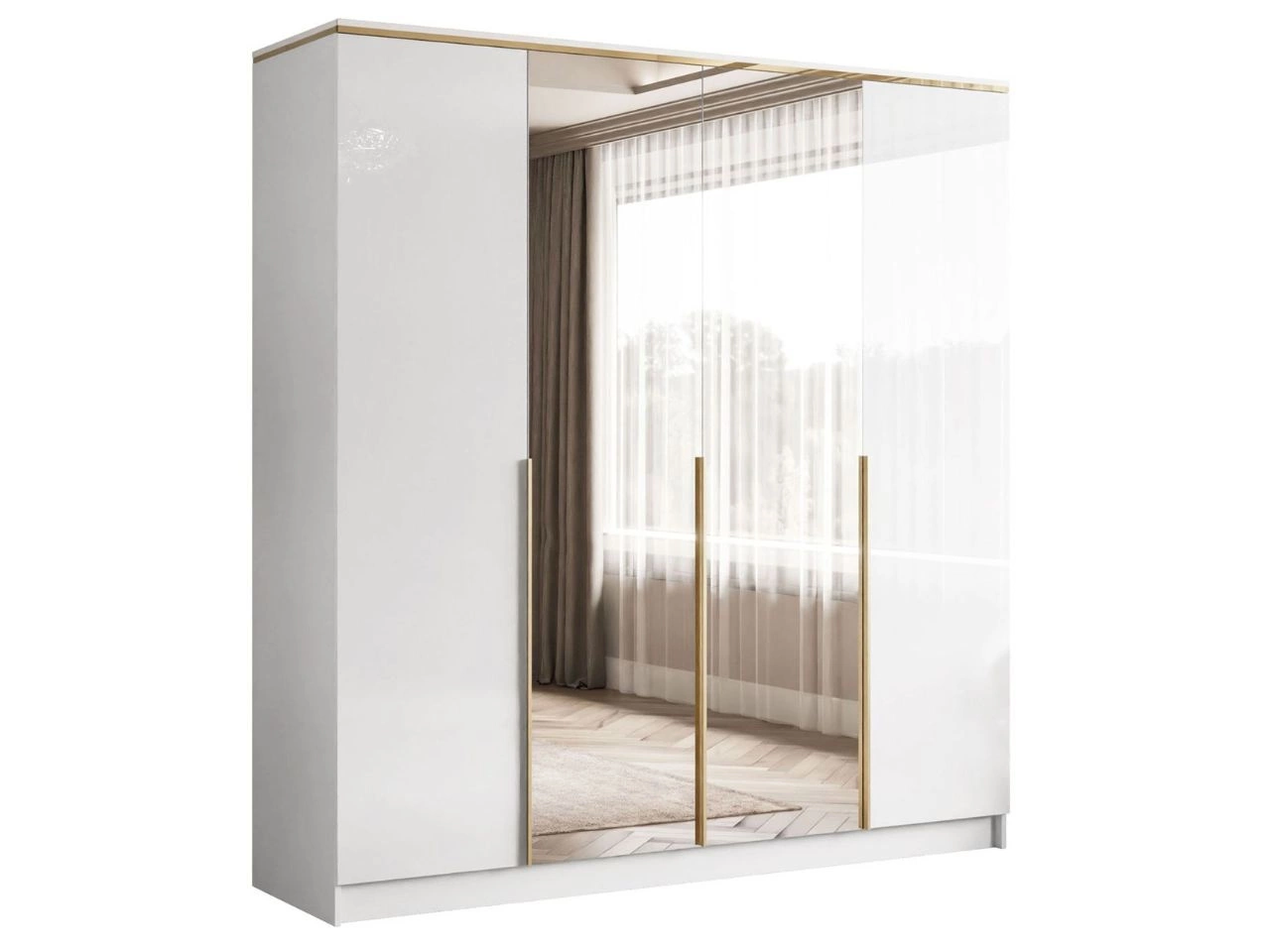 Kleiderschrank mit Spiegel 200 cm, mit Drehtüren, Schubladden und goldenen Griffen Evare Weiß Hochglanz