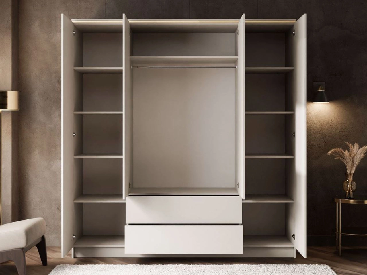 Viertürige Schrank bietet viel Stauraum für Kleidung, Accessoires und persönliche Gegenstände. Auf der Front befinden sich zwei geräumige Schubladen, die es ermöglichen, häufig genutzte Kleidungsstücke bequem zu verstauen. Im Inneren des Schranks gibt es neun praktische Regalfächer sowie eine Kleiderstange, die für eine komfortable Organisation der Garderobe sorgen. Das integrierte Push-to-Open-System ermöglicht das Öffnen der Türen mit leichtem Druck und betont die minimalistische, moderne Linienführung des Möbelstücks.