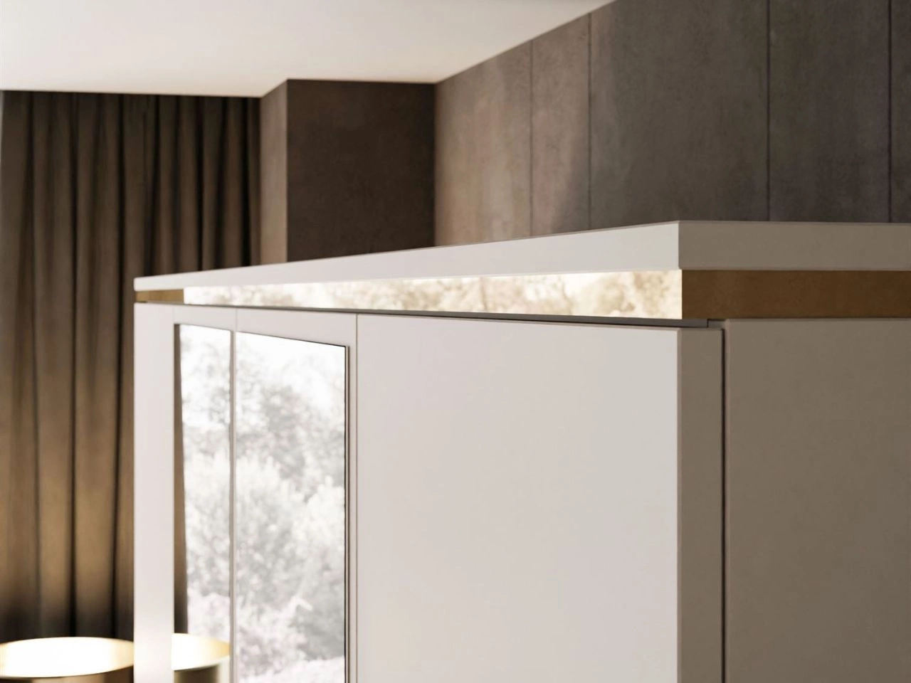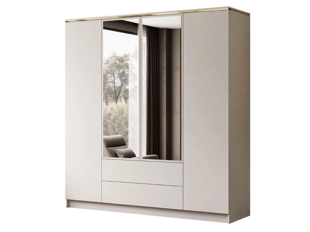Drehtürenschrank Evare in Kaschmir vereint modernes Design mit maximaler Funktionalität und eignet sich perfekt für das Schlafzimmer oder die Ankleide. Matte Fronten und Korpus bilden eine harmonische Einheit, während der dekorative goldene Zierstreifen den luxuriösen Charakter des Möbelstücks unterstreicht und dem Raum besondere Eleganz verleiht. Ein zusätzlicher Vorteil sind die Spiegel auf den Fronten, die den Raum optisch vergrößern und den täglichen Komfort erhöhen.