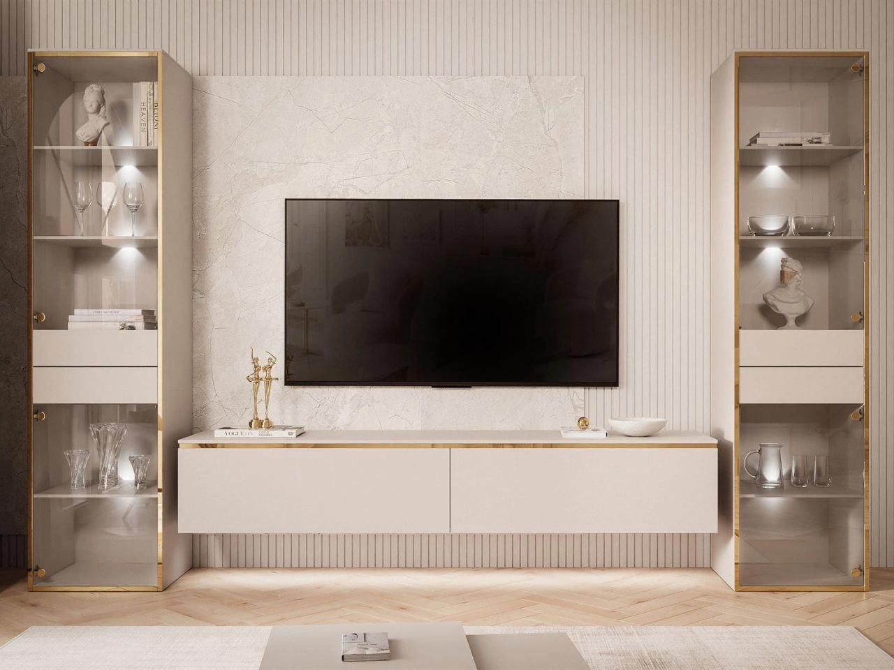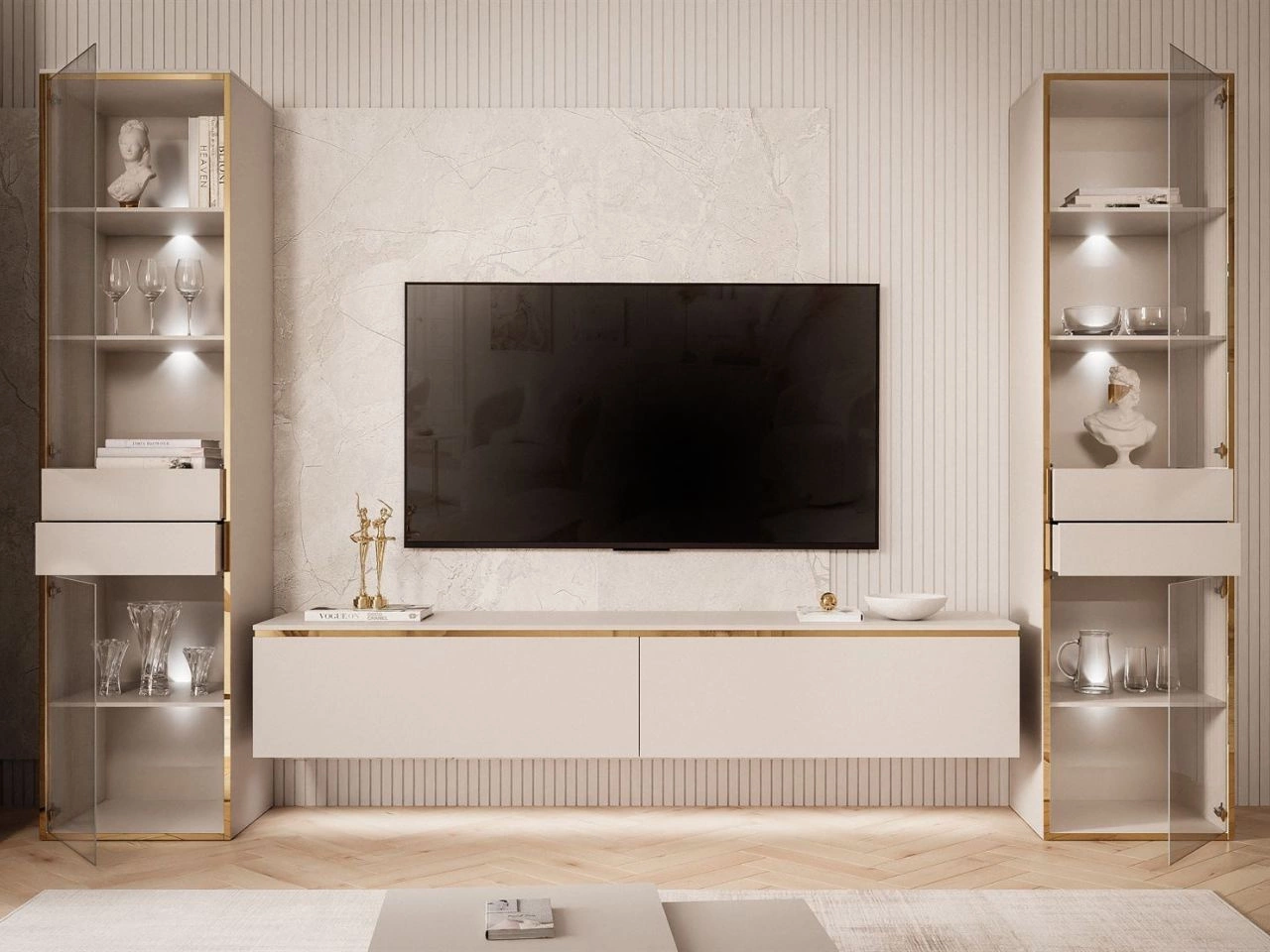 Zum Set gehören drei Elemente: ein TV-Schrank und zwei verglaste Vitrinen. Die Möbel wurden mit Liebe zum Detail gefertigt. Die Vitrine Evare ist ein schönes, minimalistisch gestaltetes Möbelstück. Sofort ins Auge fällt die goldene Zierleiste, die die Front vollständig einfasst. Dieses Detail – ebenso wie die goldenen Scharniere – verweist direkt auf den Glamour-Stil. Es gibt zwei Paare transparenter Türen aus gehärtetem Glas. Die Türen sind universell und können links oder rechts montiert werden. Das Öffnen erfolgt über das grifflose Push-To-Open-System. Auf die gleiche Weise erhält man Zugang zu zwei Schubladen.