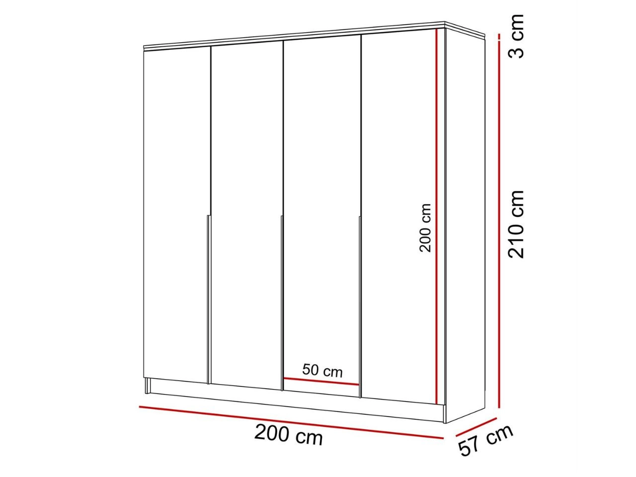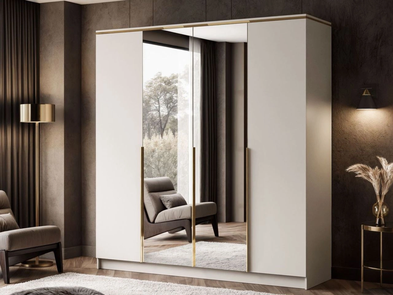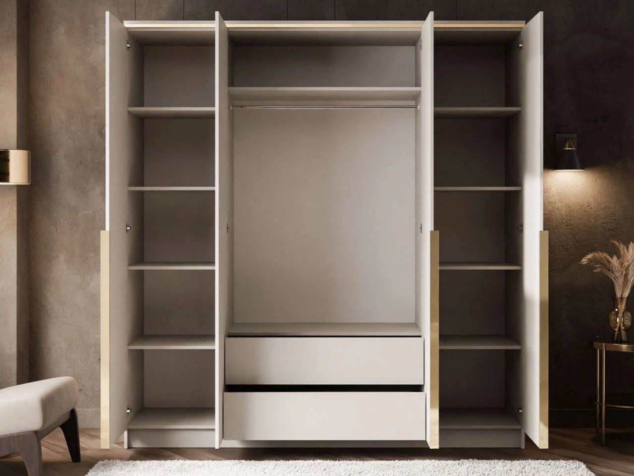 Viertürige Schrank bietet reichlich Platz für Kleidung, Accessoires und persönliche Gegenstände. Im Inneren befinden sich zwei funktionale Schubladen auf Kugelführungen mit Vollauszug, die höchsten Bedienkomfort gewährleisten. Neun geräumige Regalfächer erleichtern die Organisation der Garderobe, und eine Kleiderstange sorgt für die praktische Aufbewahrung von Hängekleidung. Die goldenen Griffe erleichtern nicht nur die tägliche Nutzung, sondern stellen auch ein dekoratives Detail dar, das den Schrank von anderen Modellen abhebt.