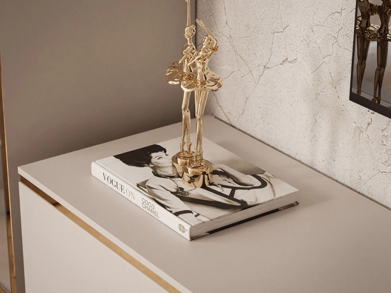 Zum Set gehören drei Elemente: ein TV-Lowboard und zwei verglaste Vitrinen. Diese Möbel wurden mit Liebe zum Detail gefertigt. Die Vitrine Evare ist ein schönes, minimalistisch gestaltetes Möbelstück. Sofort ins Auge fällt die goldene Leiste, die die Front rundum einfasst. Dieses Element – ebenso wie die goldenen Scharniere – verweist direkt auf den Glamour-Stil. Es gibt zwei Paare transparenter Türen aus gehärtetem Glas. Die Türen sind universell und lassen sich sowohl links- als auch rechtsanschlagend montieren. Das Öffnen erfolgt über das grifflose Push-to-Open-System. Drücken zum Öffnen. Auf die gleiche Weise gelangt man zu den zwei Schubladen.