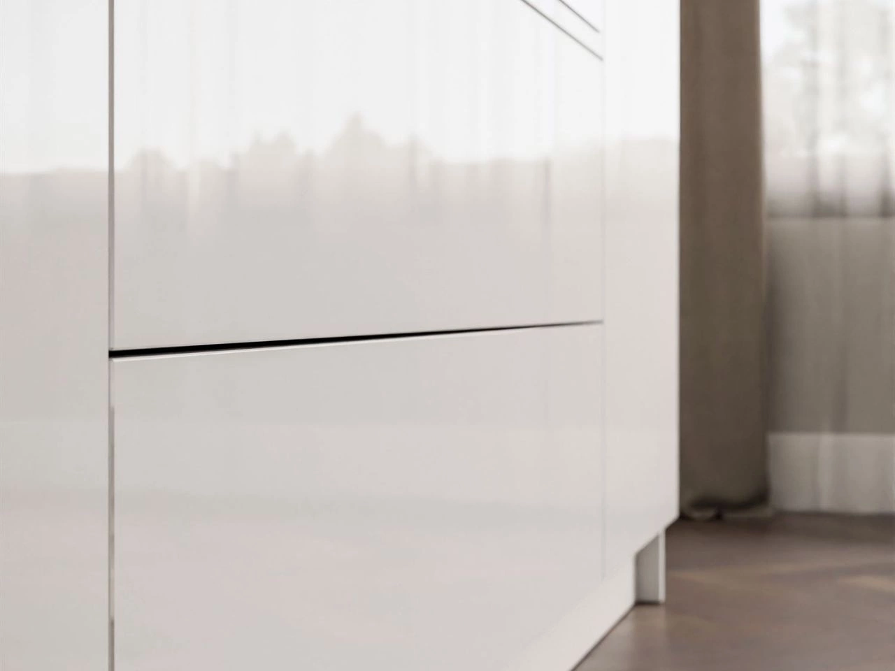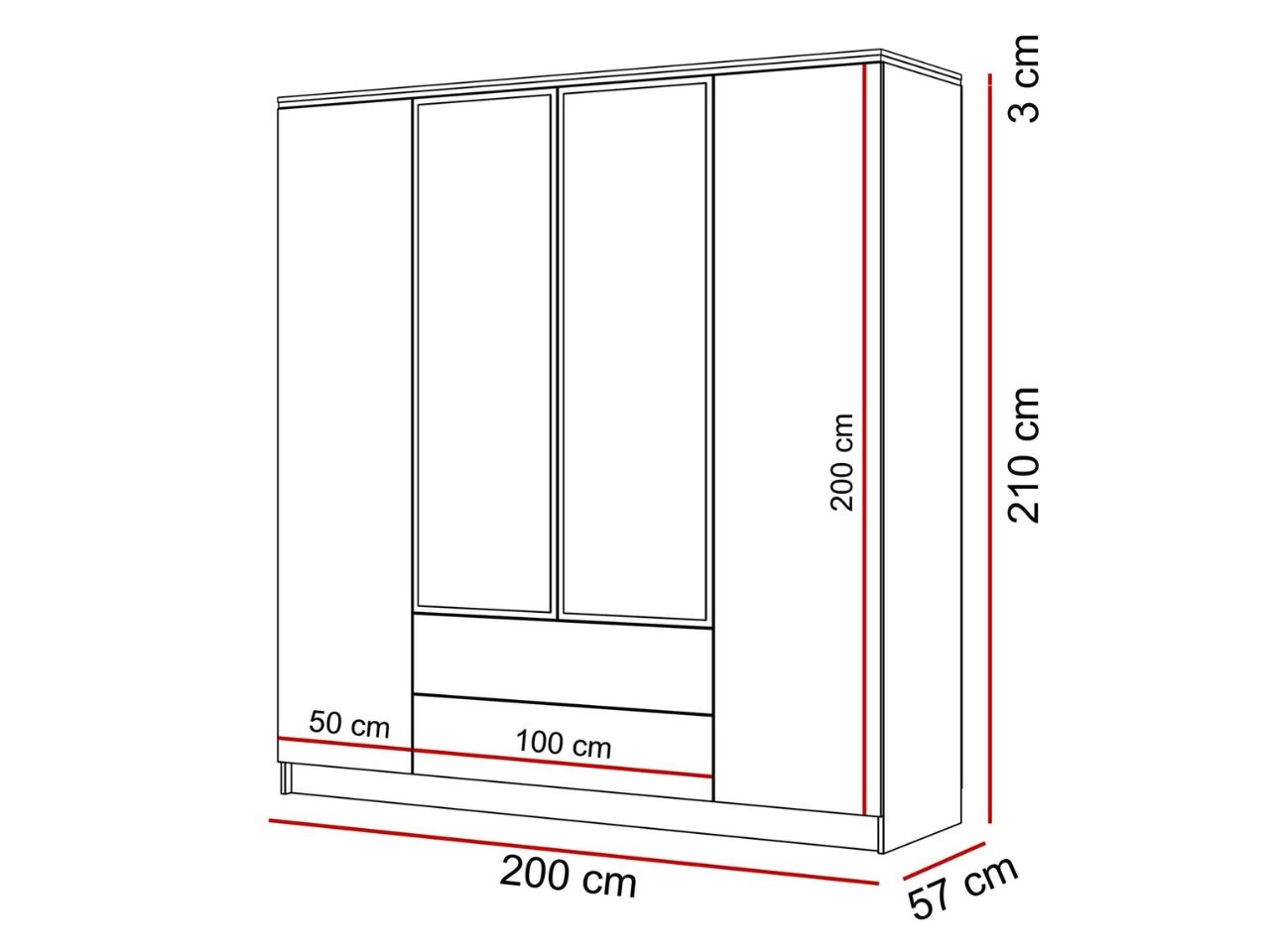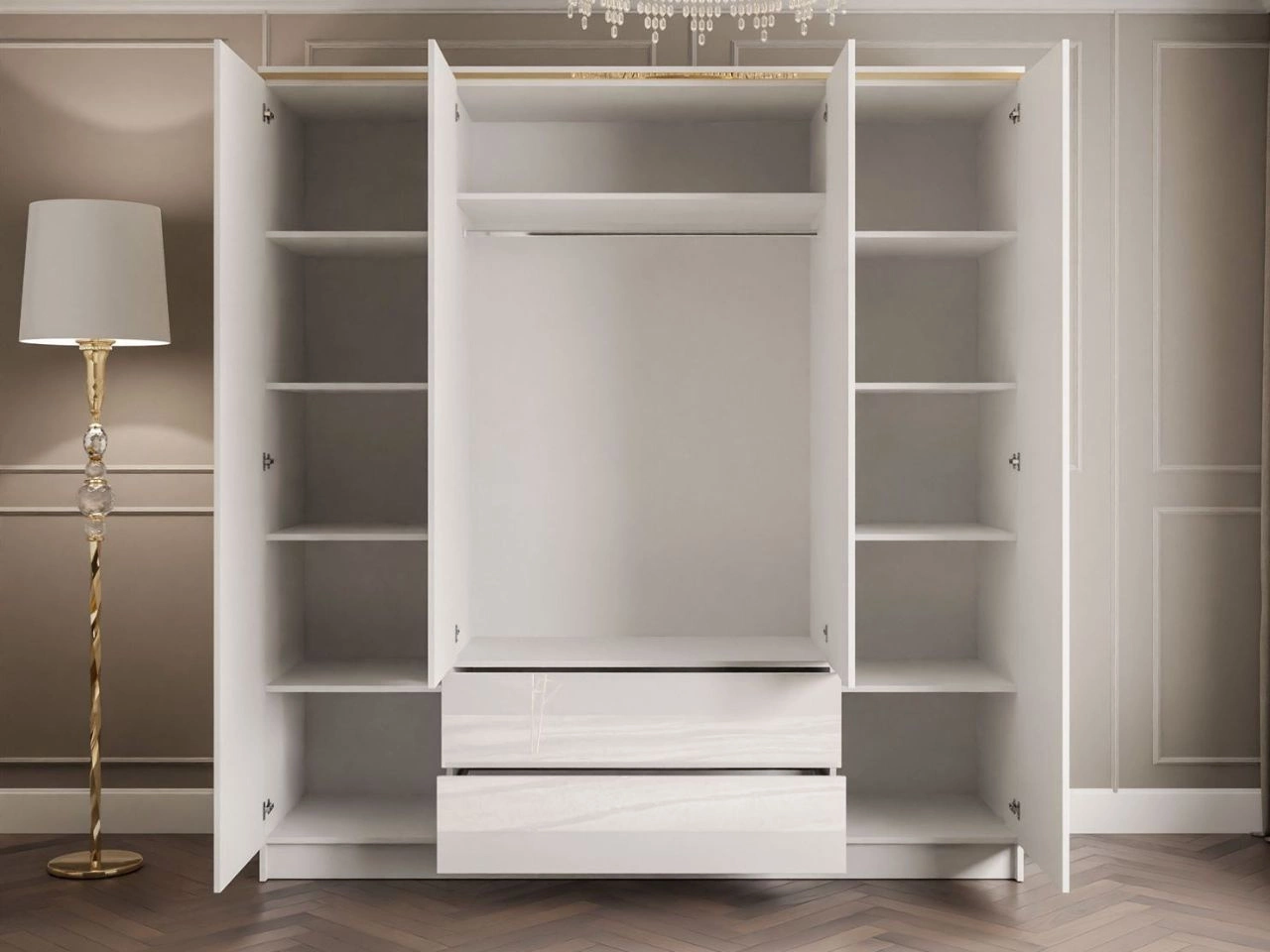Viertürige Schrank bietet viel Stauraum für Kleidung, Accessoires und persönliche Gegenstände. Auf der Front befinden sich zwei geräumige Schubladen, die es ermöglichen, häufig genutzte Kleidungsstücke bequem zu verstauen. Im Inneren des Schranks gibt es neun praktische Regalfächer sowie eine Kleiderstange, die für eine komfortable Organisation der Garderobe sorgen. Das integrierte Push-to-Open-System ermöglicht das Öffnen der Türen mit leichtem Druck und betont die minimalistische, moderne Linienführung des Möbelstücks.