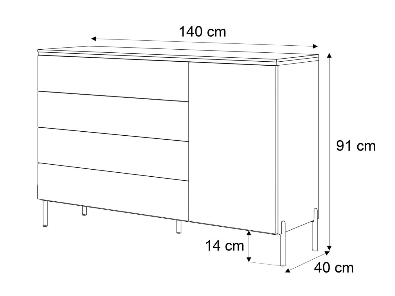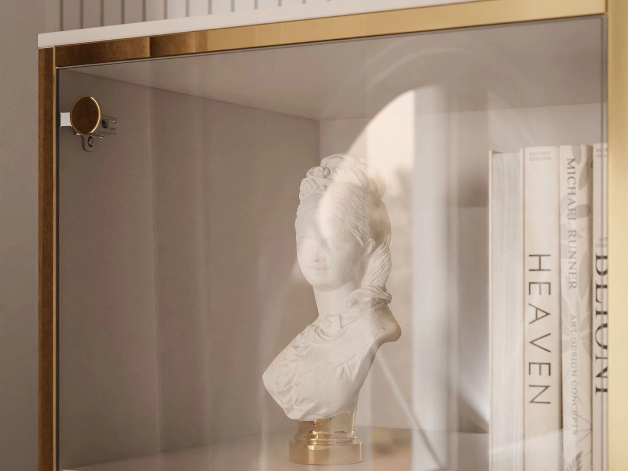 Die Kommode Evare zeichnet sich durch vier geräumige Schubladen aus, die auf Kugelführungen laufen und einen Vollauszug bieten. Auch hier kommt das Push-to-Open-System zum Einsatz. Auf der rechten Seite befindet sich ein praktisches Fach mit klappbarer Tür. Innen teilt ein Einlegeboden die Nische und erhöht die Funktionalität. Unter der Deckplatte verläuft eine goldene Zierleiste – exakt dieselbe, die auch an der Front der Vitrine zu sehen ist.