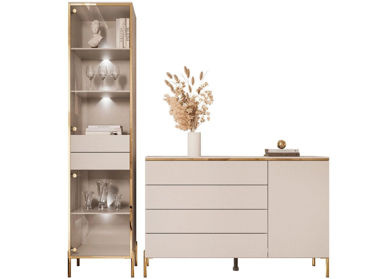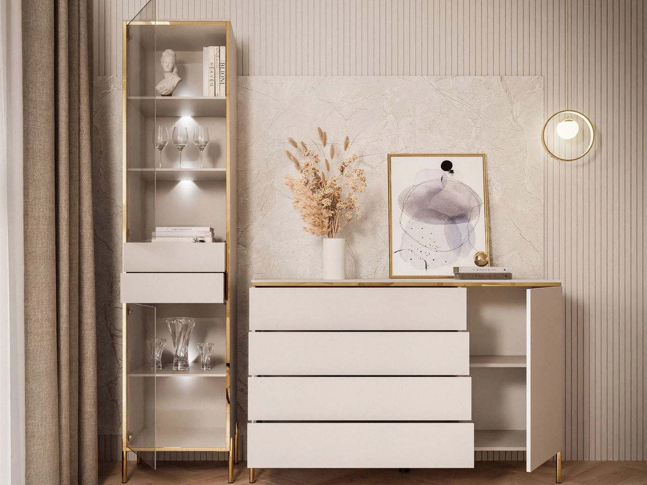 Das Set umfasst zwei Elemente: eine Kommode und eine verglaste Vitrine, die mit höchster Liebe zum Detail gestaltet wurden. Die Vitrine Evare begeistert durch eine schlichte, elegante Form, betont durch eine dekorative goldene Leiste, die den gesamten Frontbereich umläuft. Goldene Scharniere verweisen zusätzlich auf die Glamour-Ästhetik. Das Möbel verfügt über zwei Paare Türen aus gehärtetem Glas, die wahlweise links- oder rechtsanschlagend montiert werden können. Das Öffnen erfolgt über das moderne Push-to-Open-System – ein leichter Druck genügt, um Zugang zum Inneren zu erhalten. Auf die gleiche Weise werden auch die zwei zentral angeordneten Schubladen geöffnet.