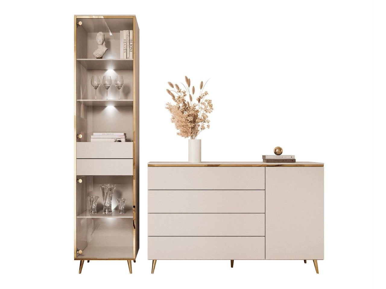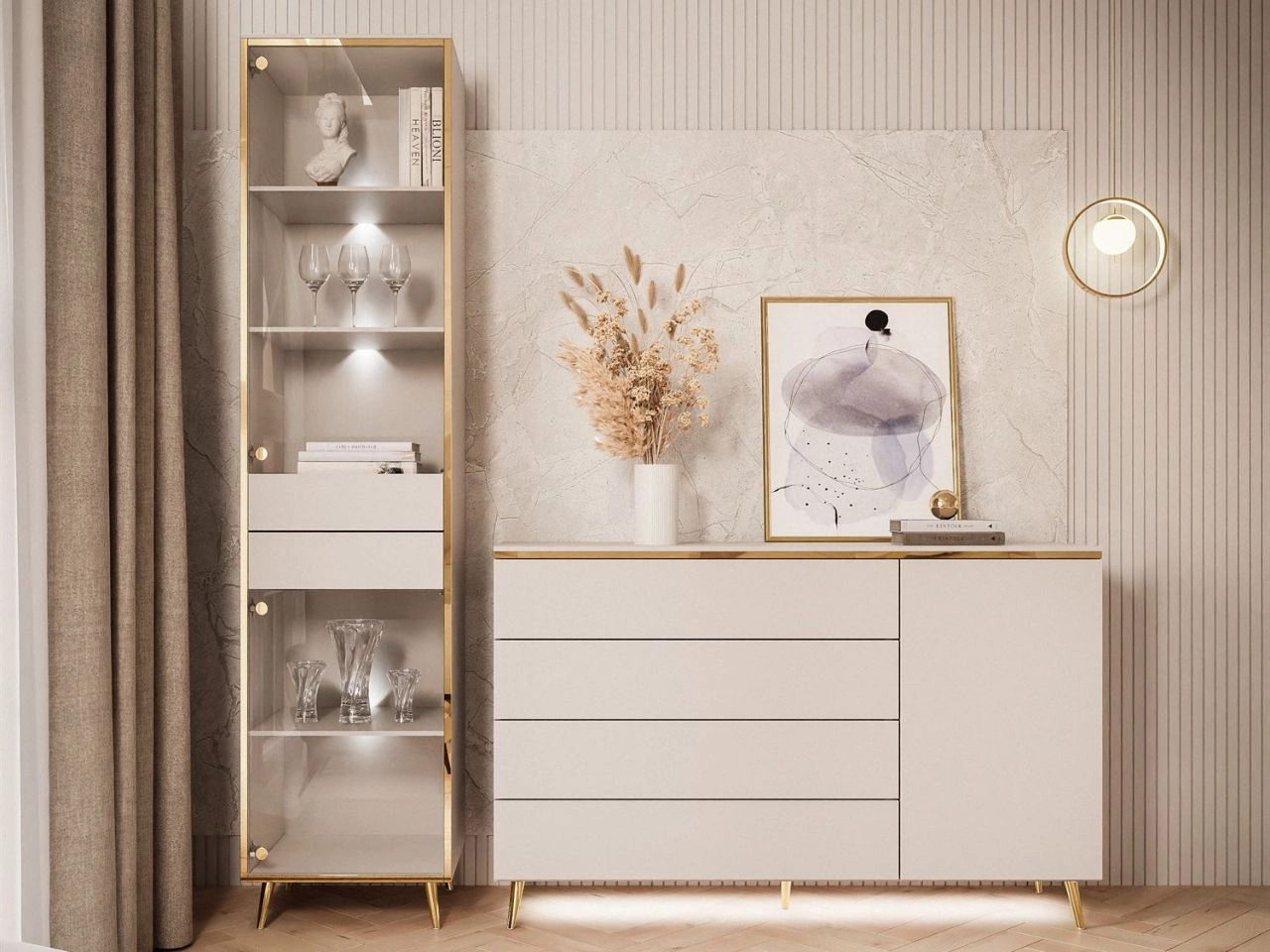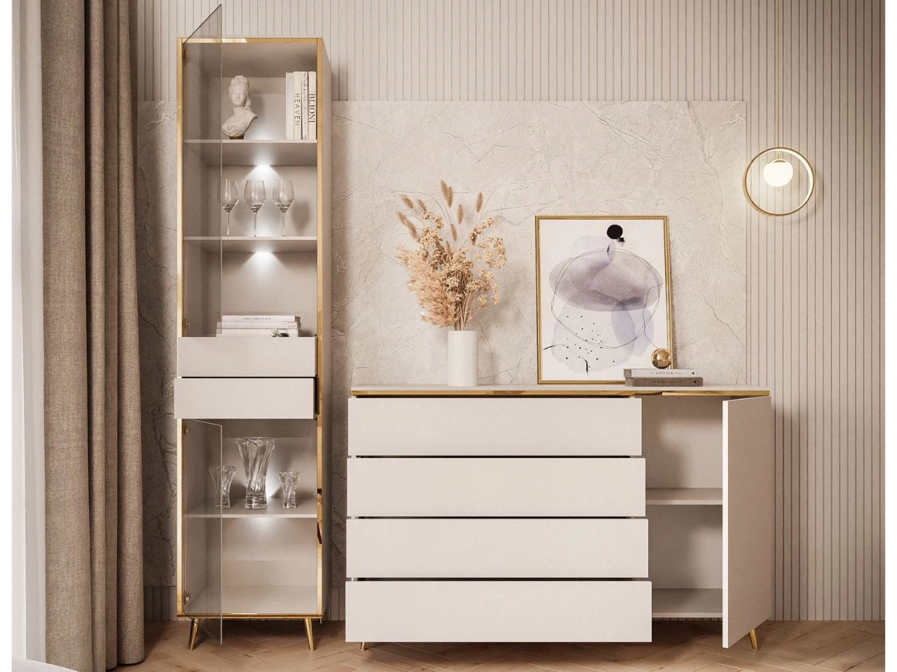 Das Set umfasst zwei Elemente: eine Kommode und eine verglaste Vitrine, die mit höchster Liebe zum Detail gestaltet wurden. Die Vitrine Evare begeistert durch eine schlichte, elegante Form, betont durch eine dekorative goldene Leiste, die den gesamten Frontbereich umläuft. Goldene Scharniere verweisen zusätzlich auf die Glamour-Ästhetik. Das Möbel verfügt über zwei Paare Türen aus gehärtetem Glas, die wahlweise links- oder rechtsanschlagend montiert werden können. Das Öffnen erfolgt über das moderne Push-to-Open-System – ein leichter Druck genügt, um Zugang zum Inneren zu erhalten. Auf die gleiche Weise werden auch die zwei zentral angeordneten Schubladen geöffnet.