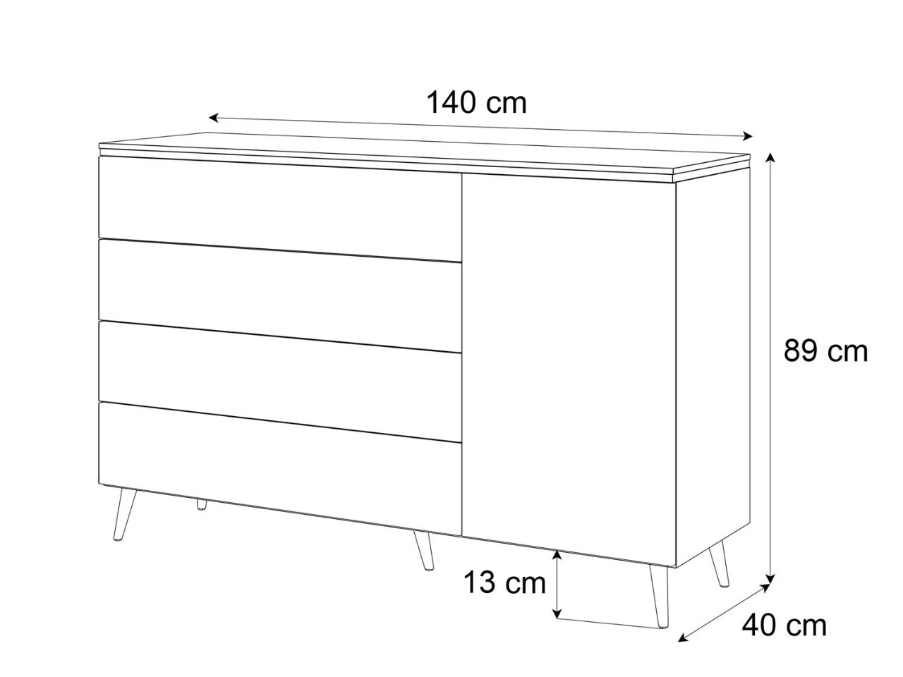 Die Kommode Evare zeichnet sich durch vier geräumige Schubladen aus, die auf Kugelführungen laufen und einen Vollauszug bieten. Auch hier kommt das Push-to-Open-System zum Einsatz. Auf der rechten Seite befindet sich ein praktisches Fach mit klappbarer Tür. Innen teilt ein Einlegeboden die Nische und erhöht die Funktionalität. Unter der Deckplatte verläuft eine goldene Zierleiste – exakt dieselbe, die auch an der Front der Vitrine zu sehen ist.