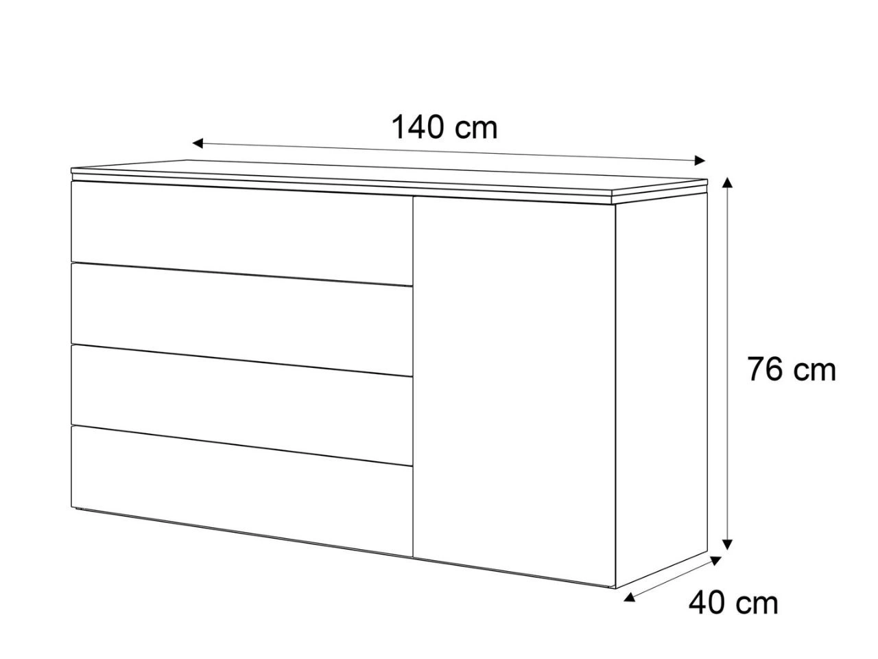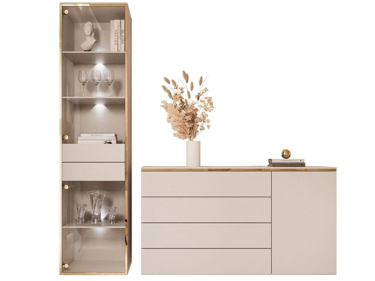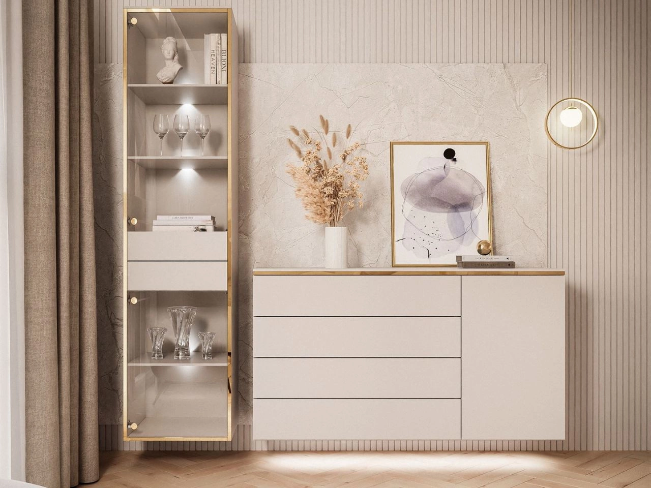 Die Kommode Evare zeichnet sich durch vier geräumige Schubladen aus, die auf Kugelführungen laufen und einen Vollauszug bieten. Auch hier kommt das Push-to-Open-System zum Einsatz. Auf der rechten Seite befindet sich ein praktisches Fach mit klappbarer Tür. Innen teilt ein Einlegeboden die Nische und erhöht die Funktionalität. Unter der Deckplatte verläuft eine goldene Zierleiste – exakt dieselbe, die auch an der Front der Vitrine zu sehen ist.