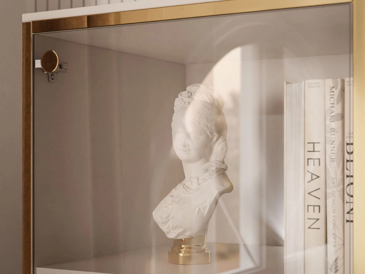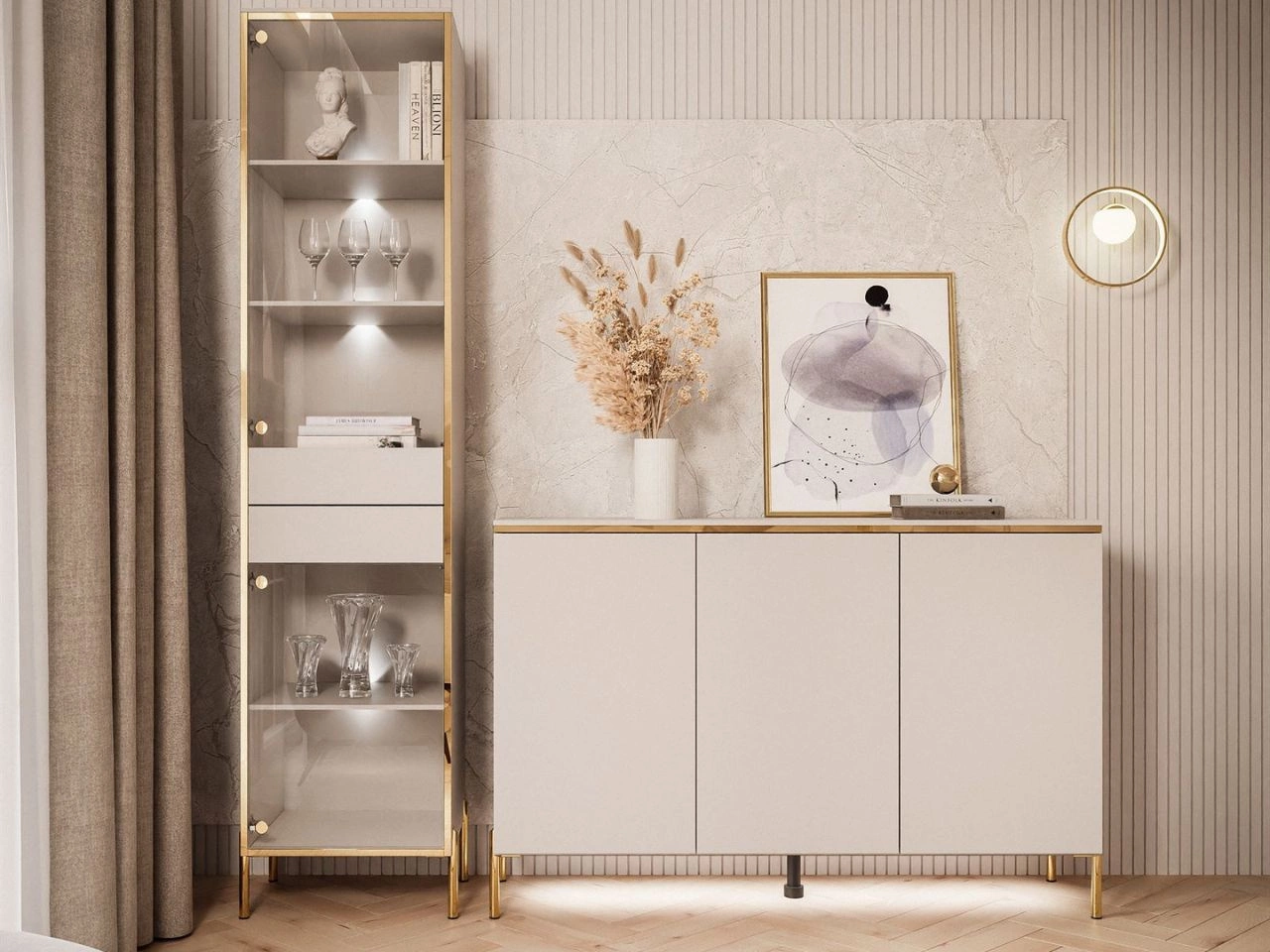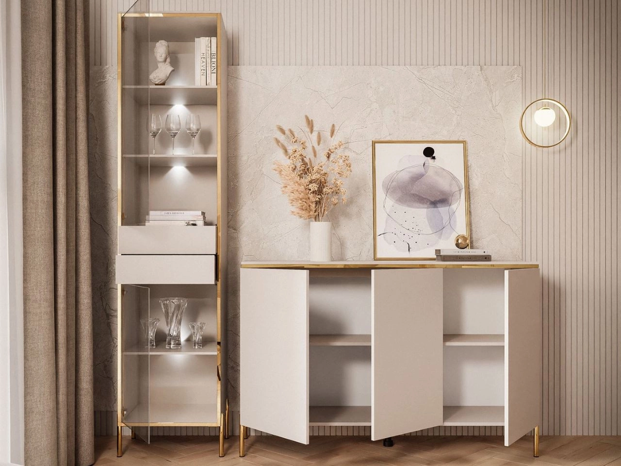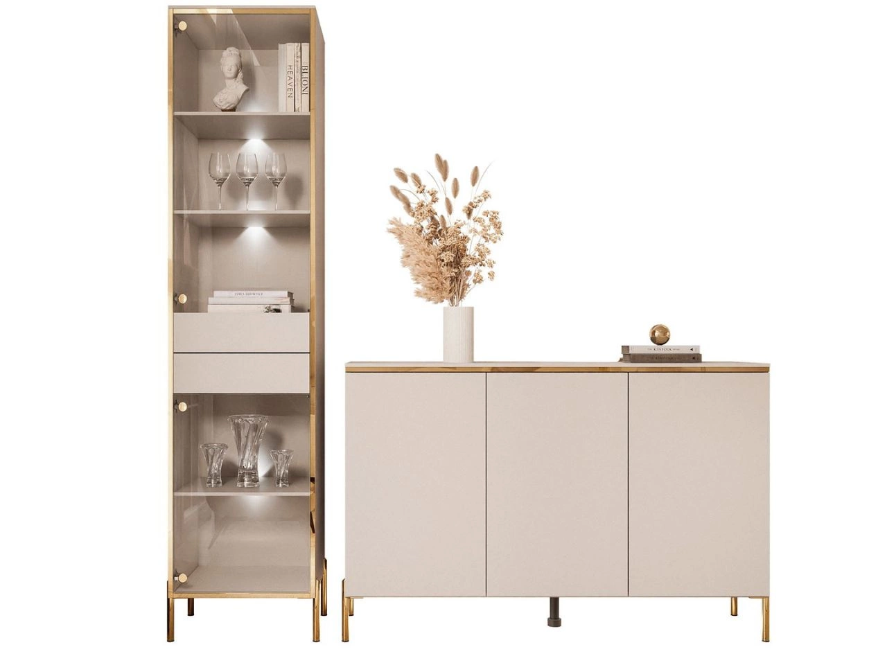 Das Set umfasst zwei Elemente: eine Kommode und eine verglaste Vitrine, die mit höchster Liebe zum Detail gestaltet wurden. Die Vitrine Evare begeistert durch eine schlichte, elegante Form, betont durch eine dekorative goldene Leiste, die den gesamten Frontbereich umläuft. Goldene Scharniere verweisen zusätzlich auf die Glamour-Ästhetik. Das Möbel verfügt über zwei Paare Türen aus gehärtetem Glas, die wahlweise links- oder rechtsanschlagend montiert werden können. Das Öffnen erfolgt über das moderne Push-to-Open-System – ein leichter Druck genügt, um Zugang zum Inneren zu erhalten. Auf die gleiche Weise werden auch die zwei zentral angeordneten Schubladen geöffnet.