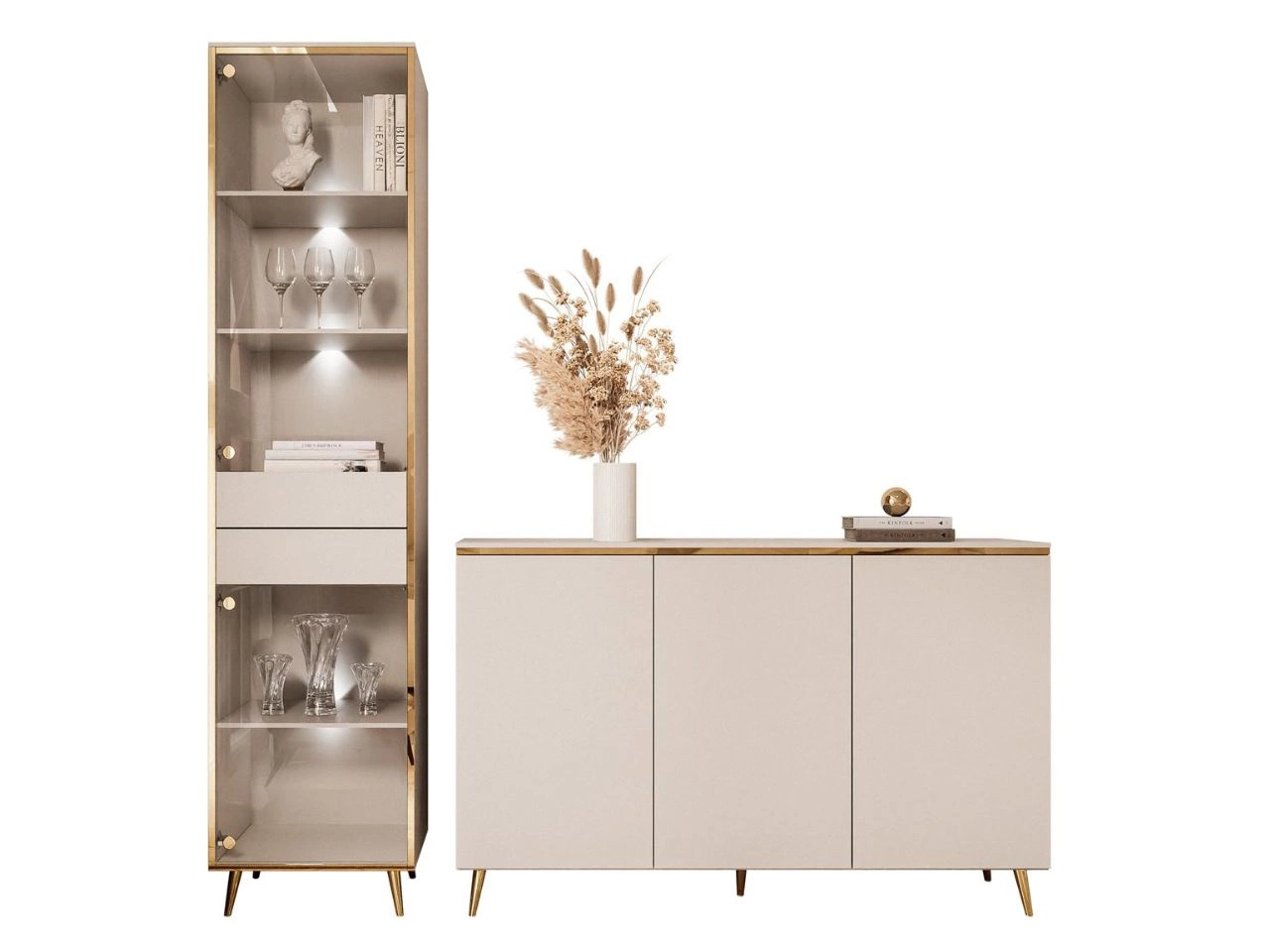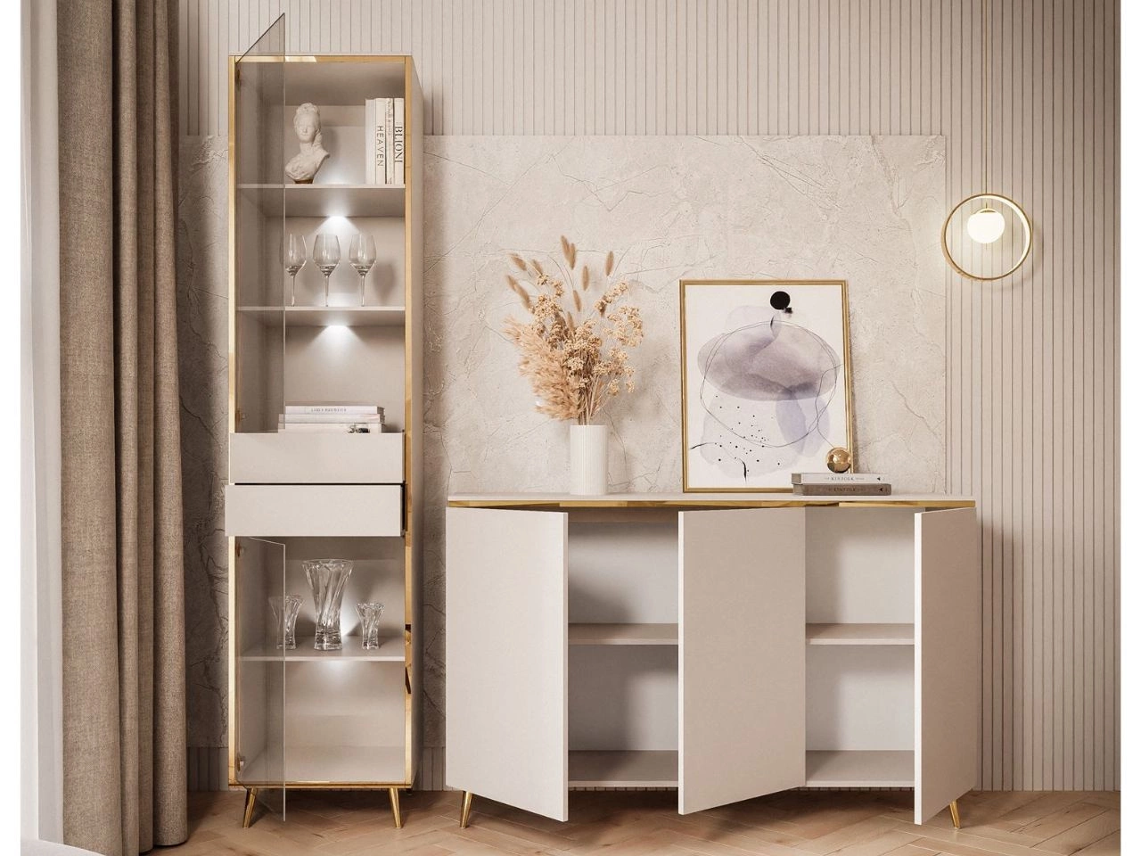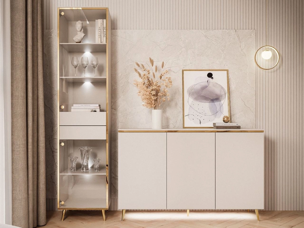 Das Set umfasst zwei Elemente: eine Kommode und eine verglaste Vitrine, die mit höchster Liebe zum Detail gestaltet wurden. Die Vitrine Evare begeistert durch eine schlichte, elegante Form, betont durch eine dekorative goldene Leiste, die den gesamten Frontbereich umläuft. Goldene Scharniere verweisen zusätzlich auf die Glamour-Ästhetik. Das Möbel verfügt über zwei Paare Türen aus gehärtetem Glas, die wahlweise links- oder rechtsanschlagend montiert werden können. Das Öffnen erfolgt über das moderne Push-to-Open-System – ein leichter Druck genügt, um Zugang zum Inneren zu erhalten. Auf die gleiche Weise werden auch die zwei zentral angeordneten Schubladen geöffnet.